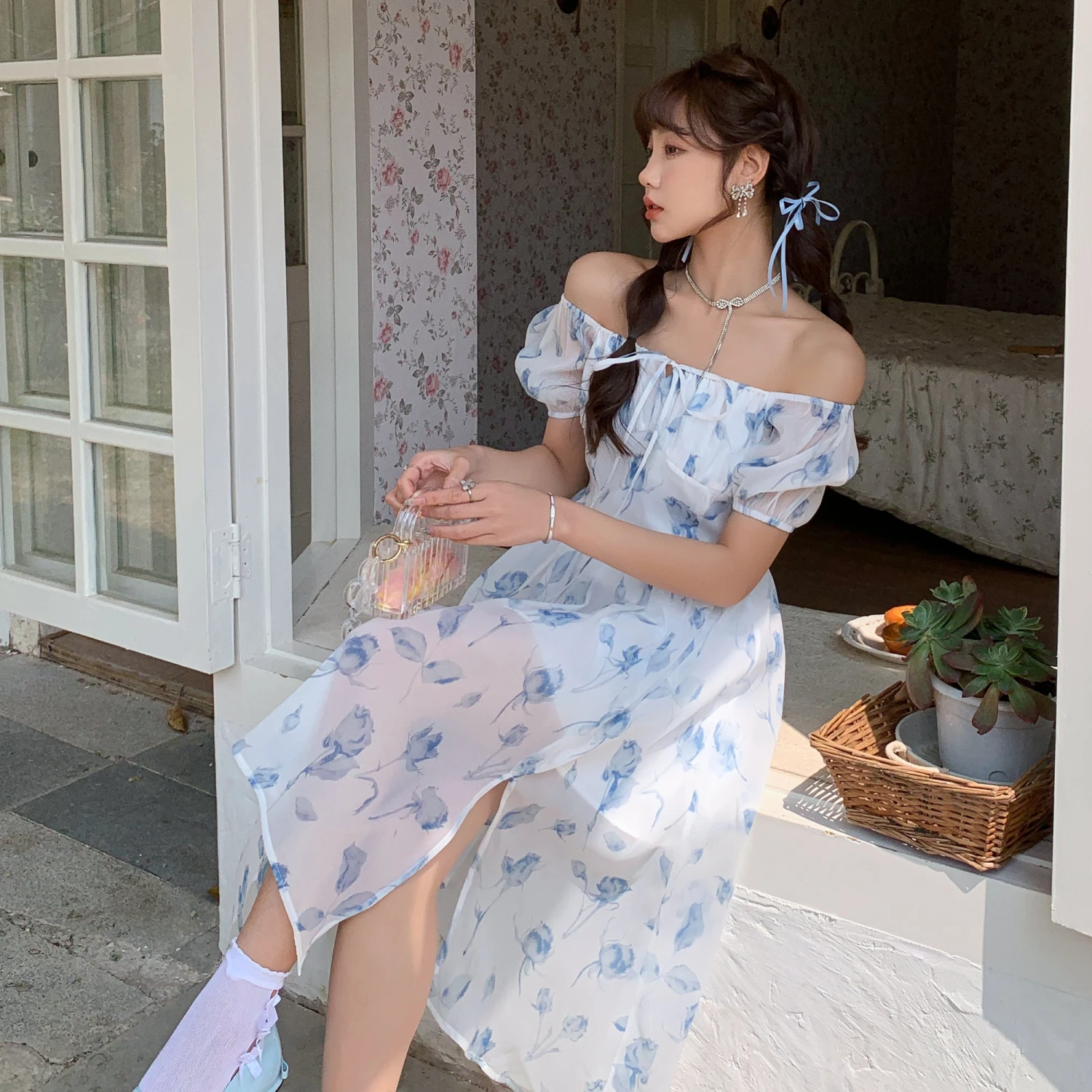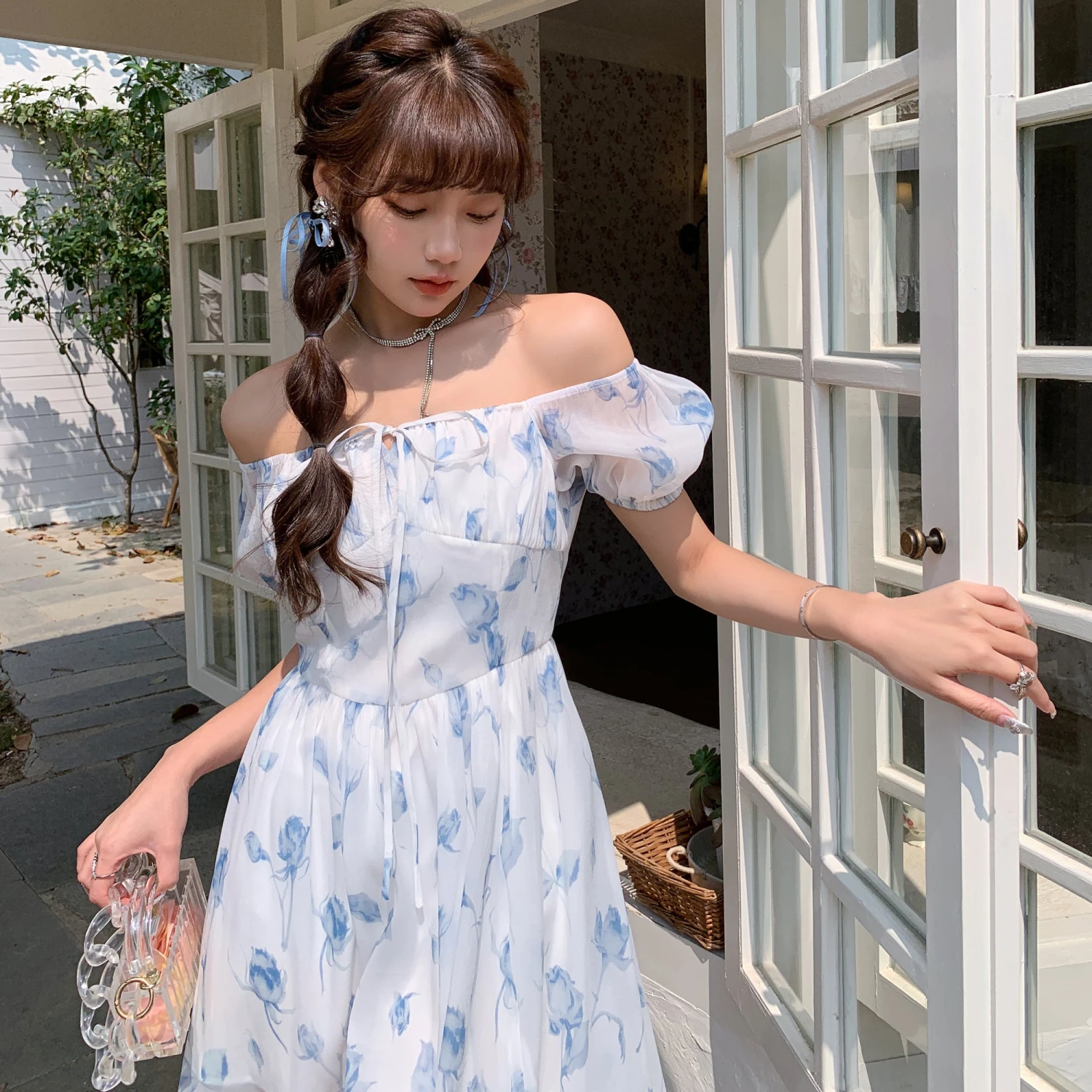 A cute dress with a blue floral print. 2way design with square neck and off shoulder.