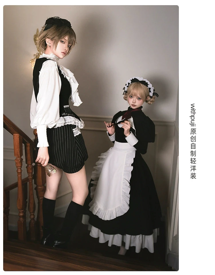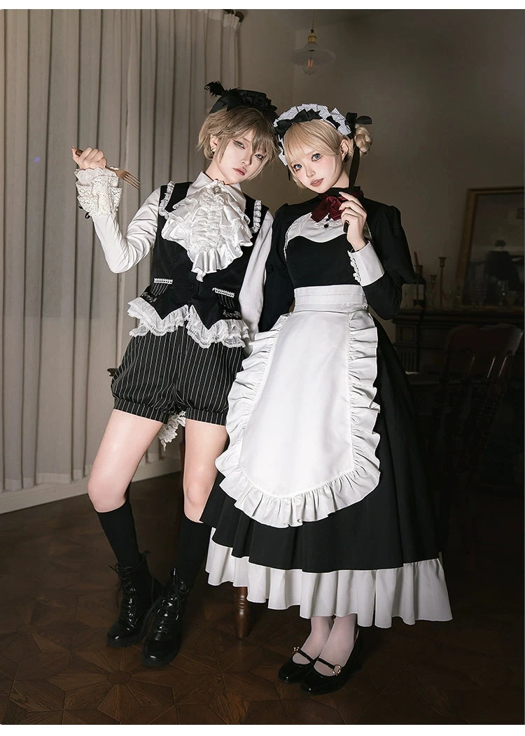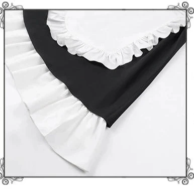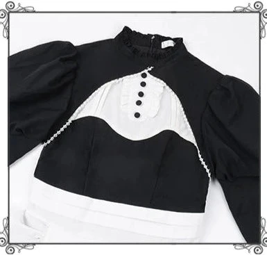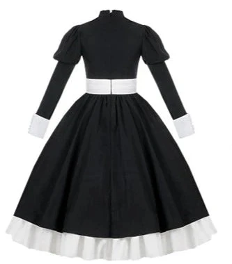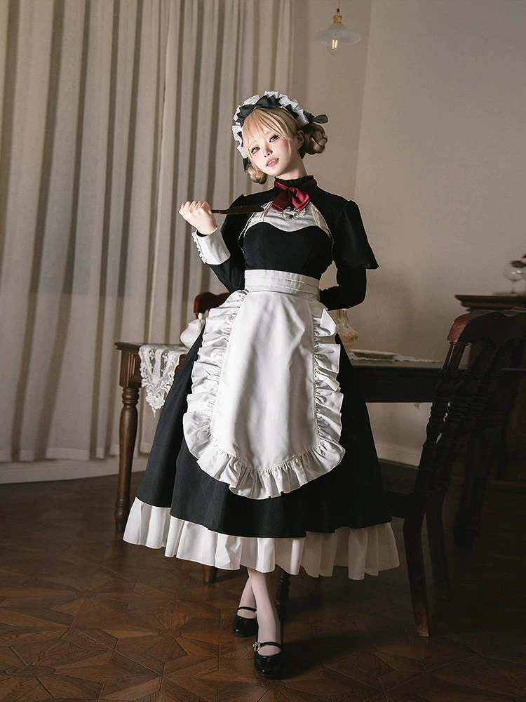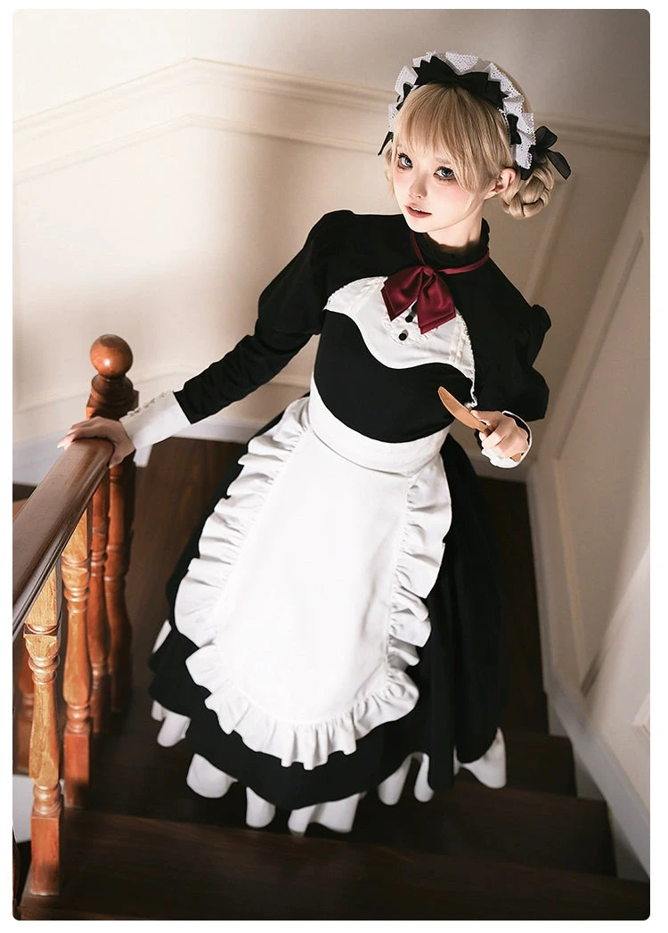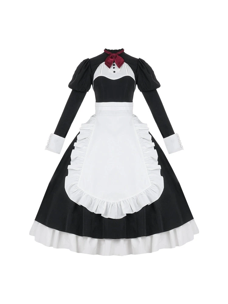 A maid-style dress in monochrome with a wine red ribbon tie as an accent.