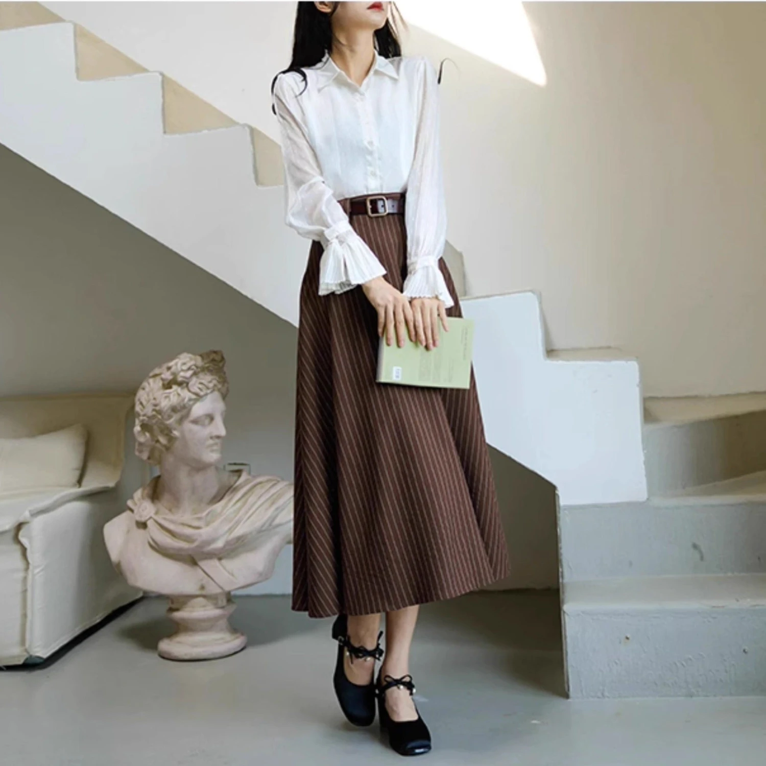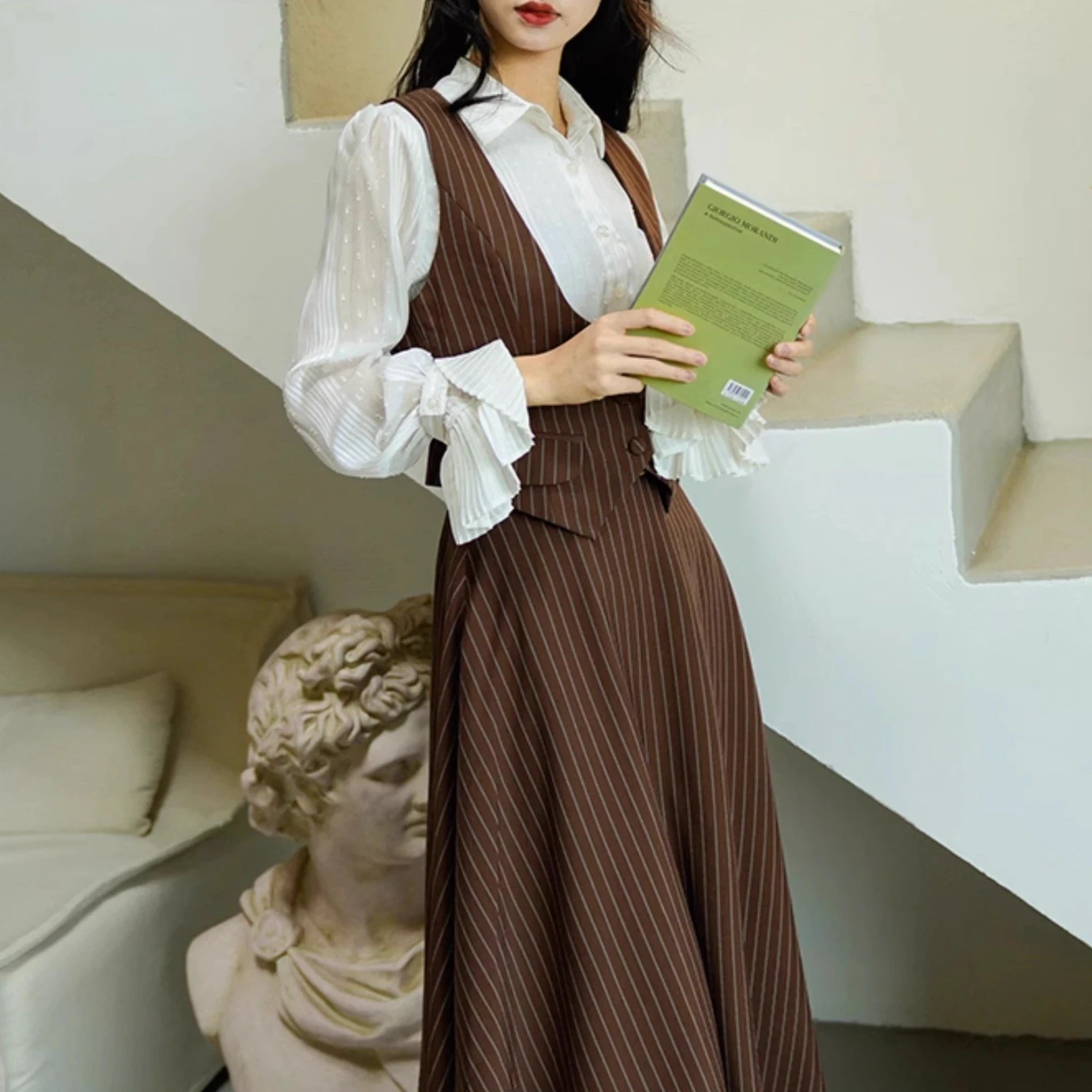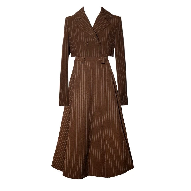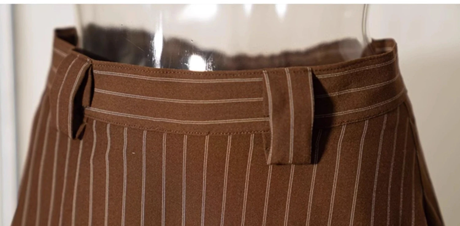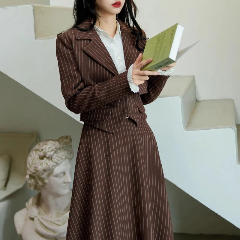 A classic jacket, vest, and skirt with a rich brown striped pattern.