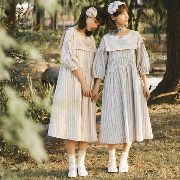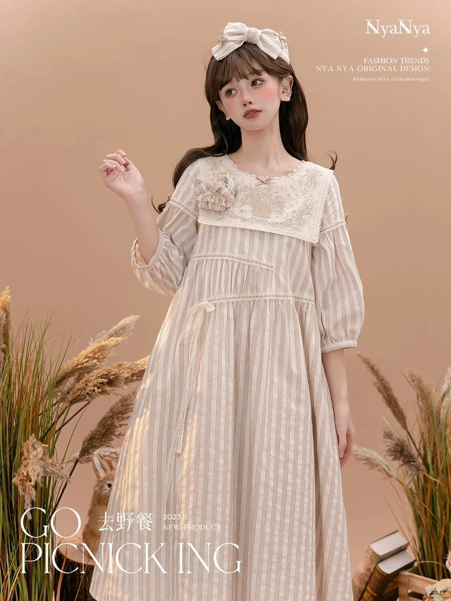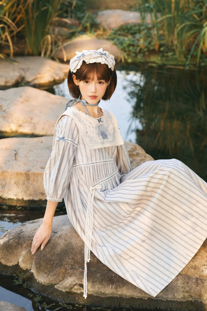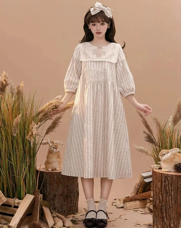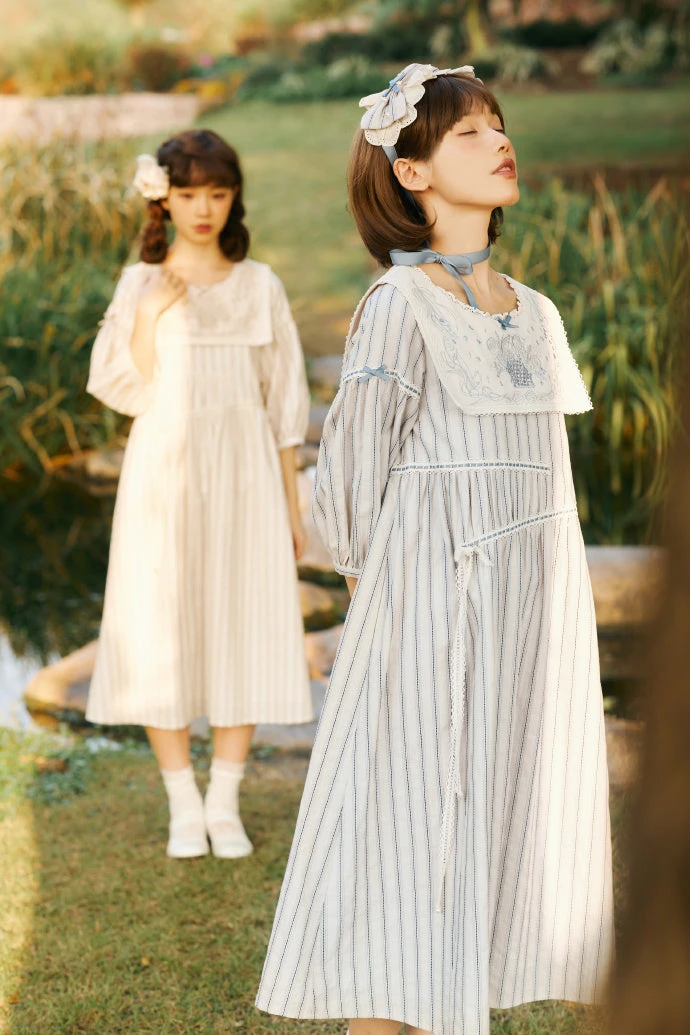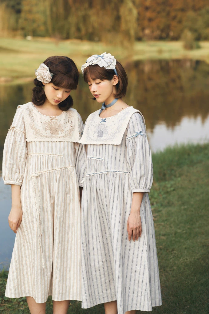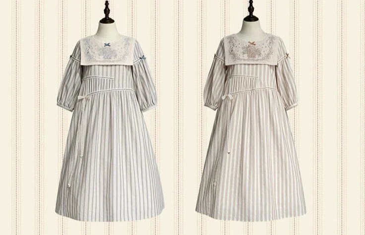 A three-quarter sleeve dress featuring smoky colored stripes and a large embroidered square collar.