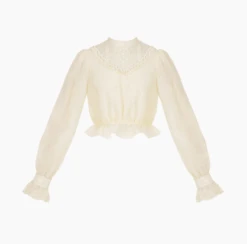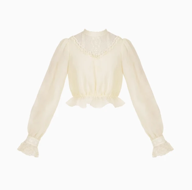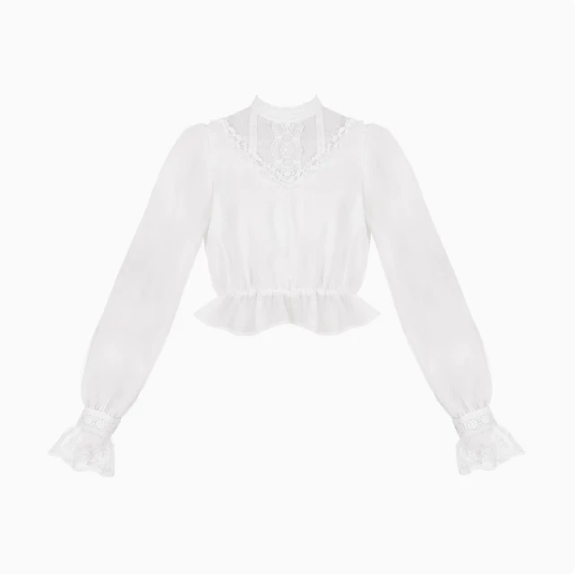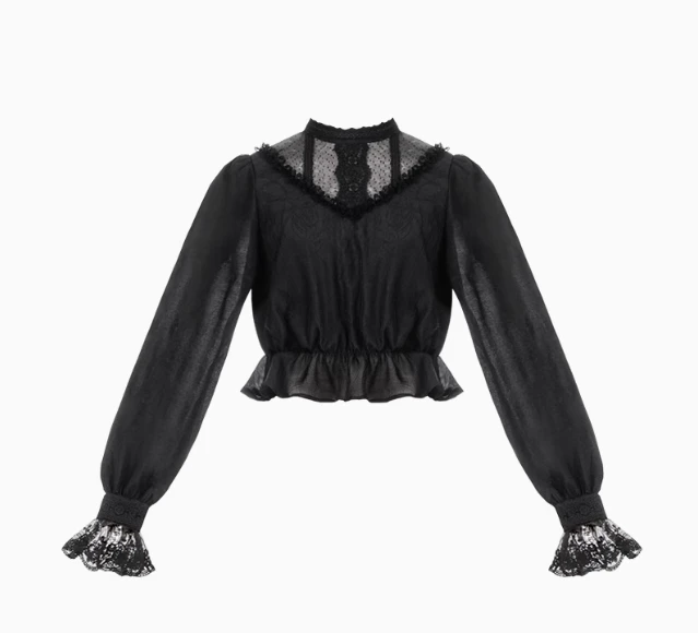 An elegant blouse with a high neck and sheer lace material.