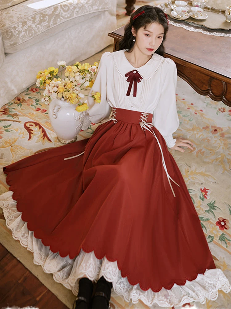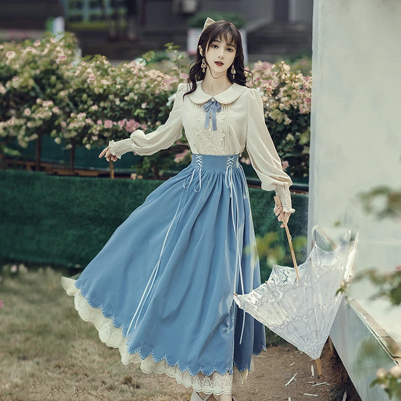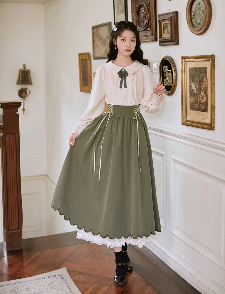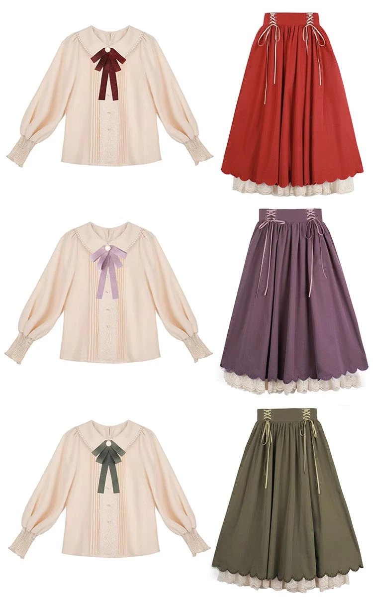 A retro classic long skirt with lace-ups and a long sleeve blouse with a ribbon tie. Click here for the short sleeve type .