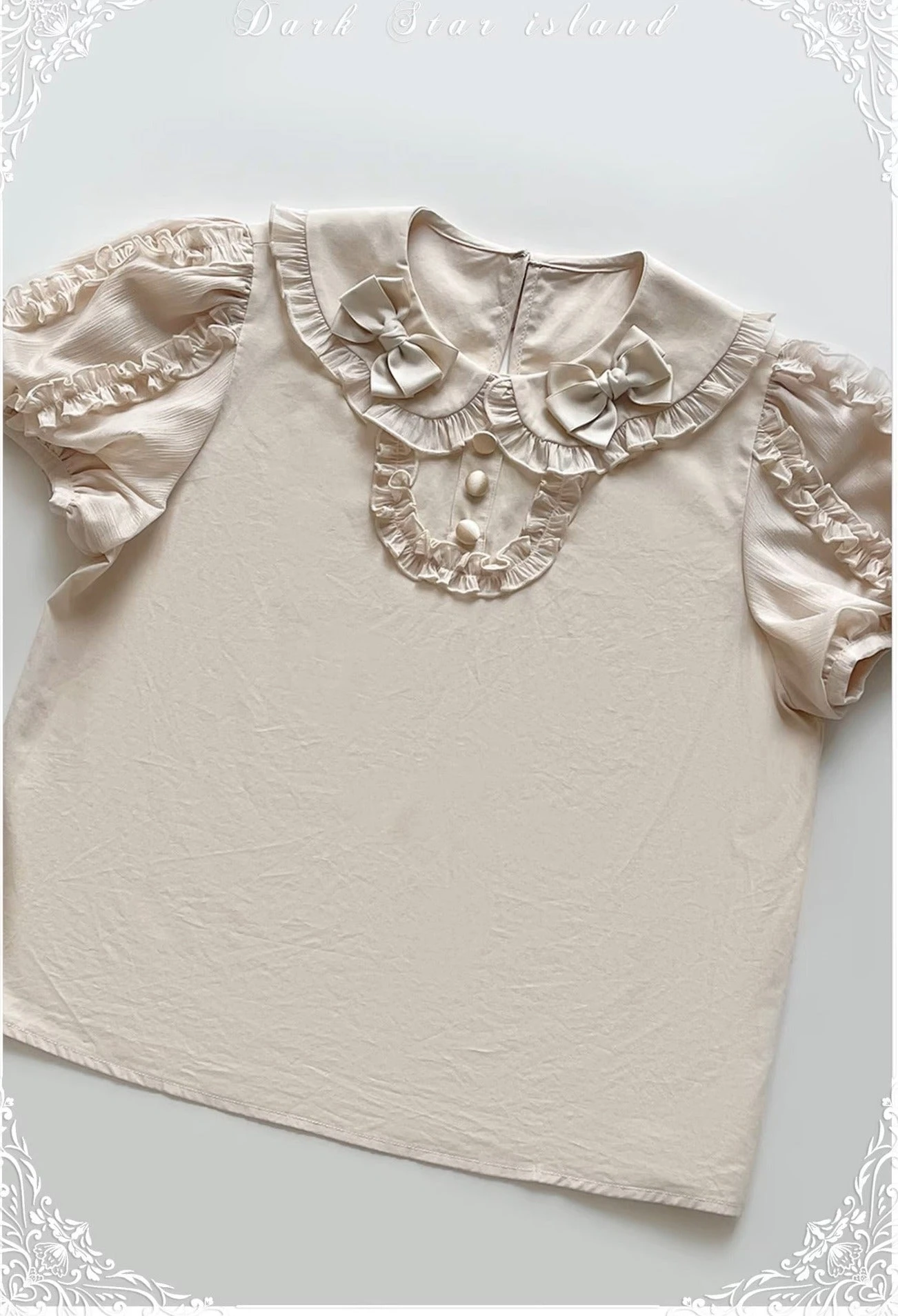 A cute short-sleeved blouse with puff sleeves, ruffles, and ribbon.
