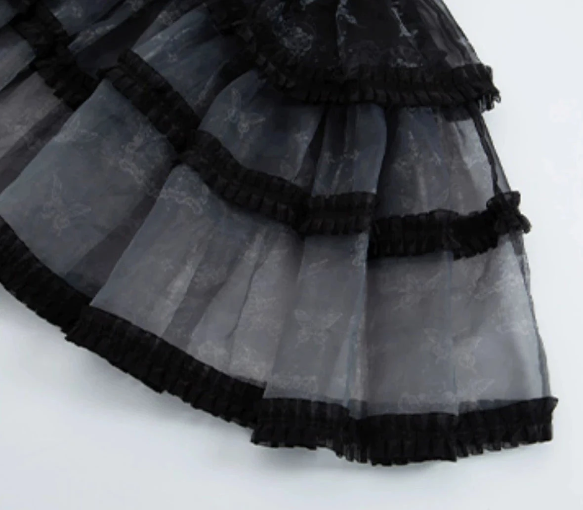 The sheer hem of the softly flared organza fabric creates a sense of airiness and transparency.