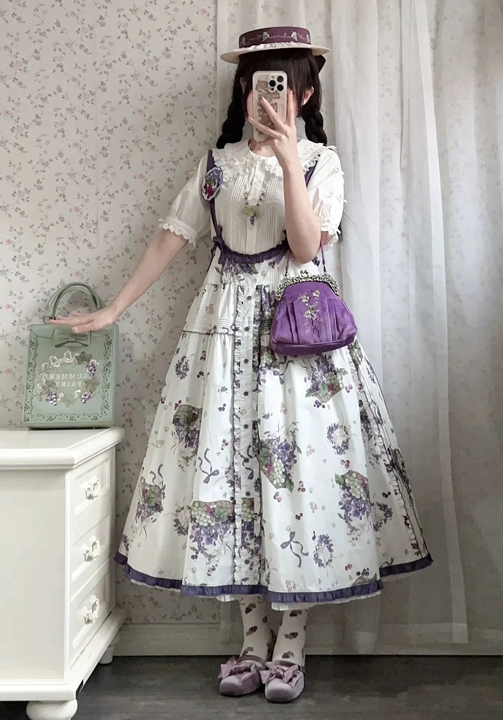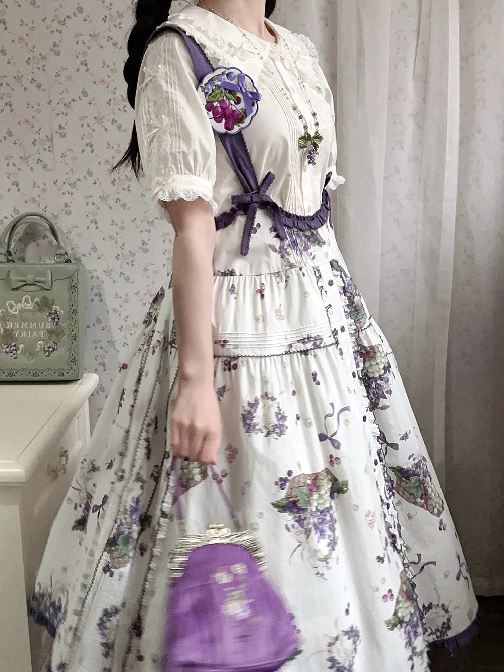 A cute jumper skirt with a grape print. We recommend pairing it with a matching blouse and apron. Click here for the strawberry print.