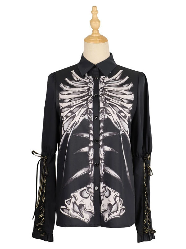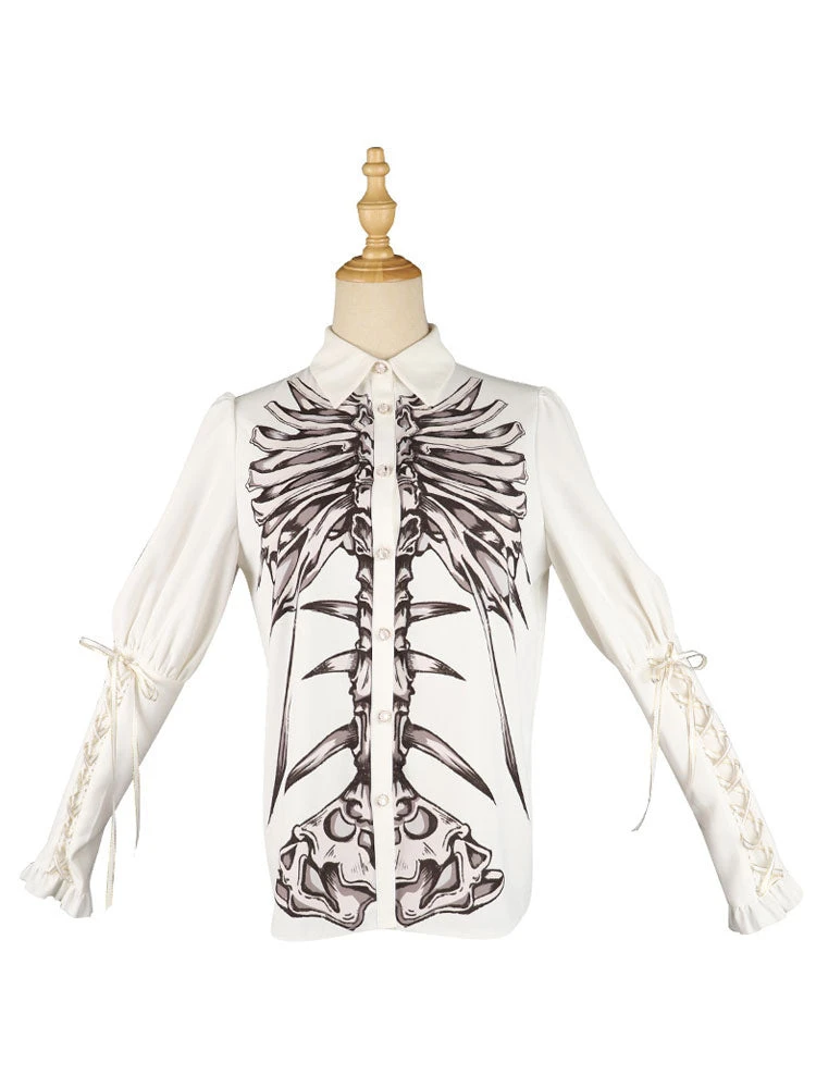 A gothic loli blouse with long cuffs and a skeleton pattern for a classic, dark look.