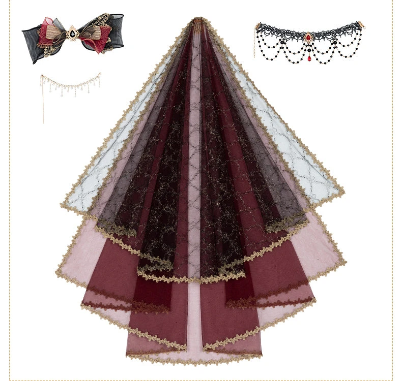 The set includes a jumper skirt, hand sleeves, veil, necklace and ribbon.