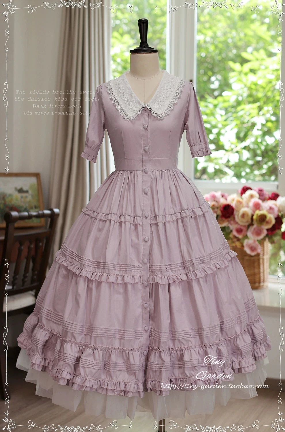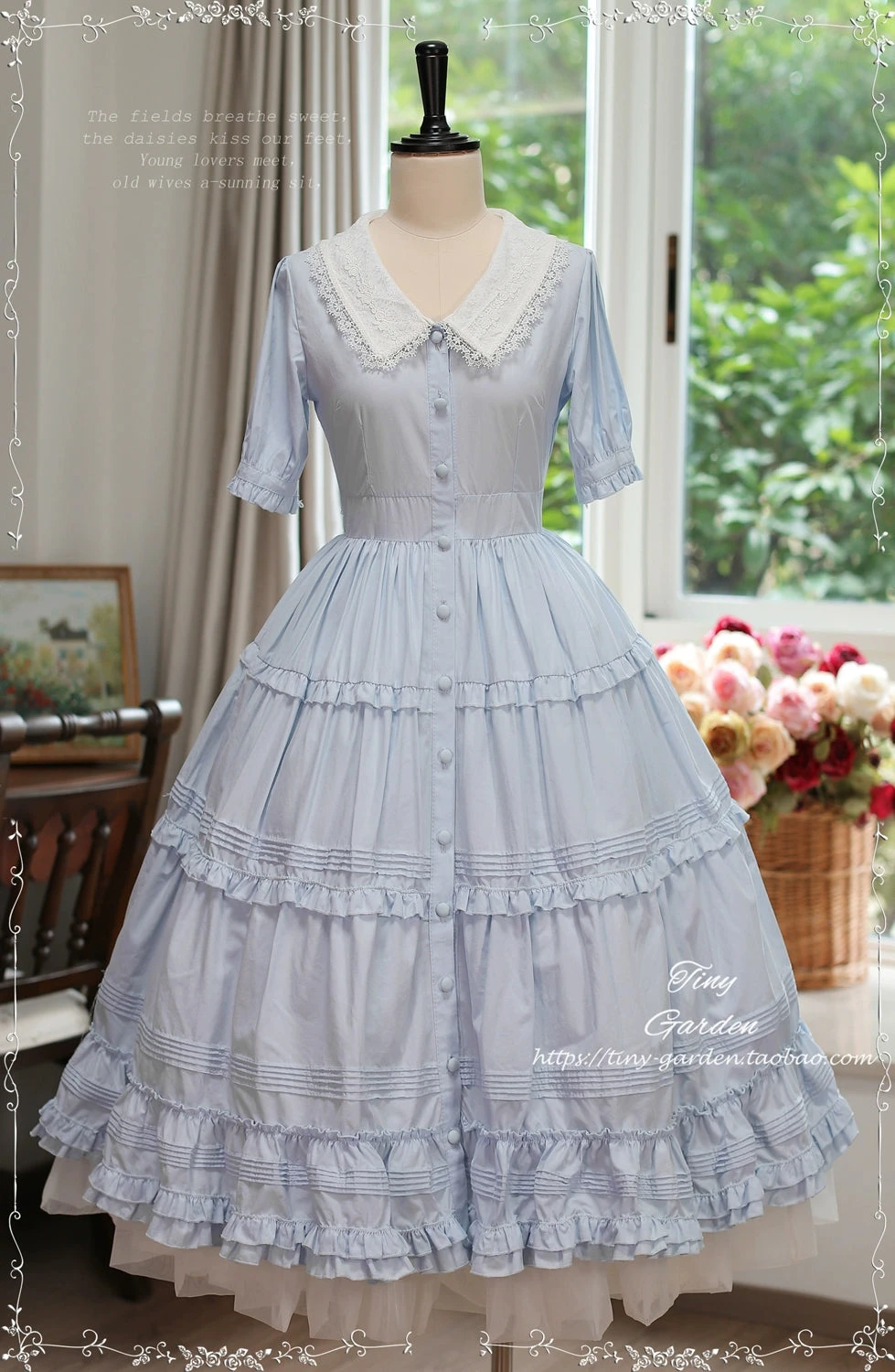 A dress with a modest lace collar and ruffles for a sophisticated and cute French girly style.