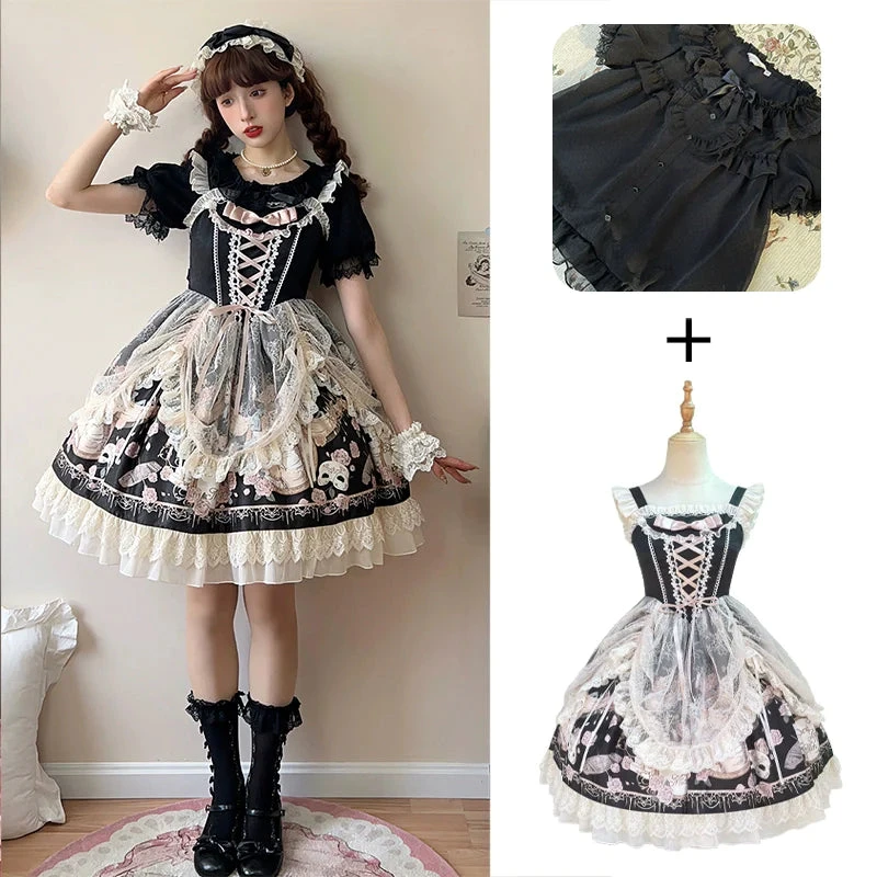 *If you choose the JSK + blouse set, the pink JSK comes with an off-white long-sleeved blouse, and the black JSK comes with a black short-sleeved blouse.