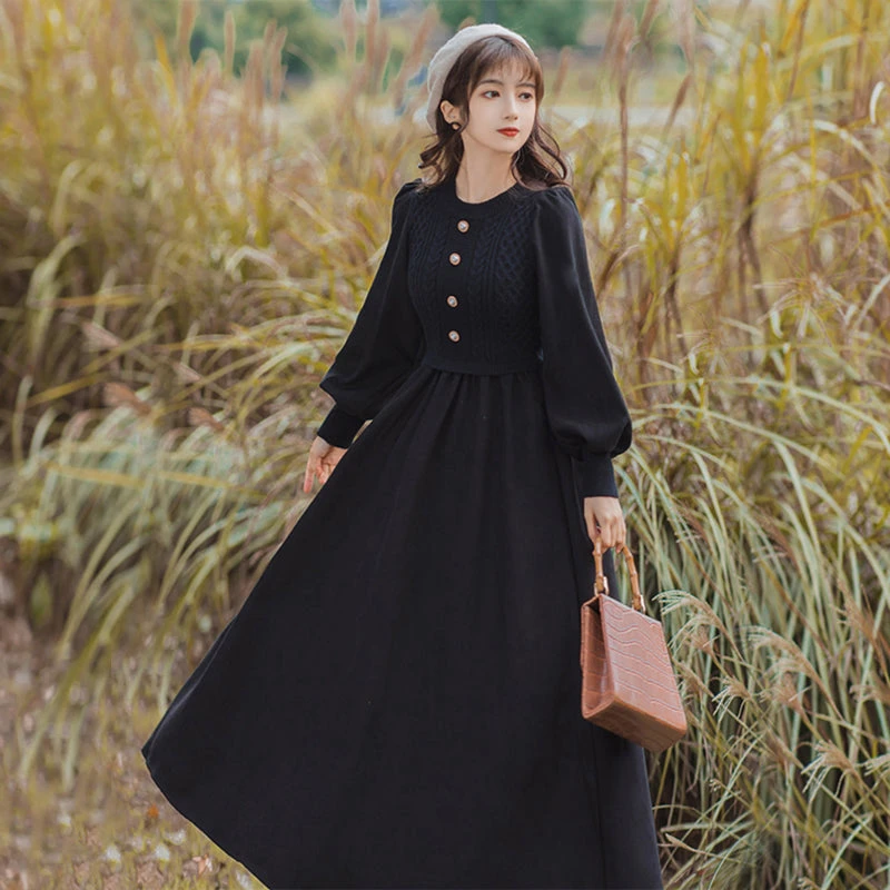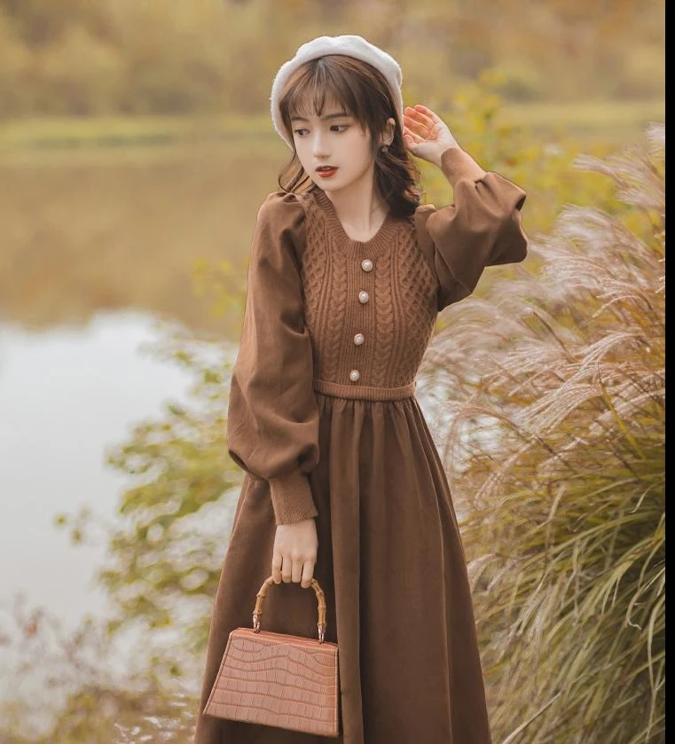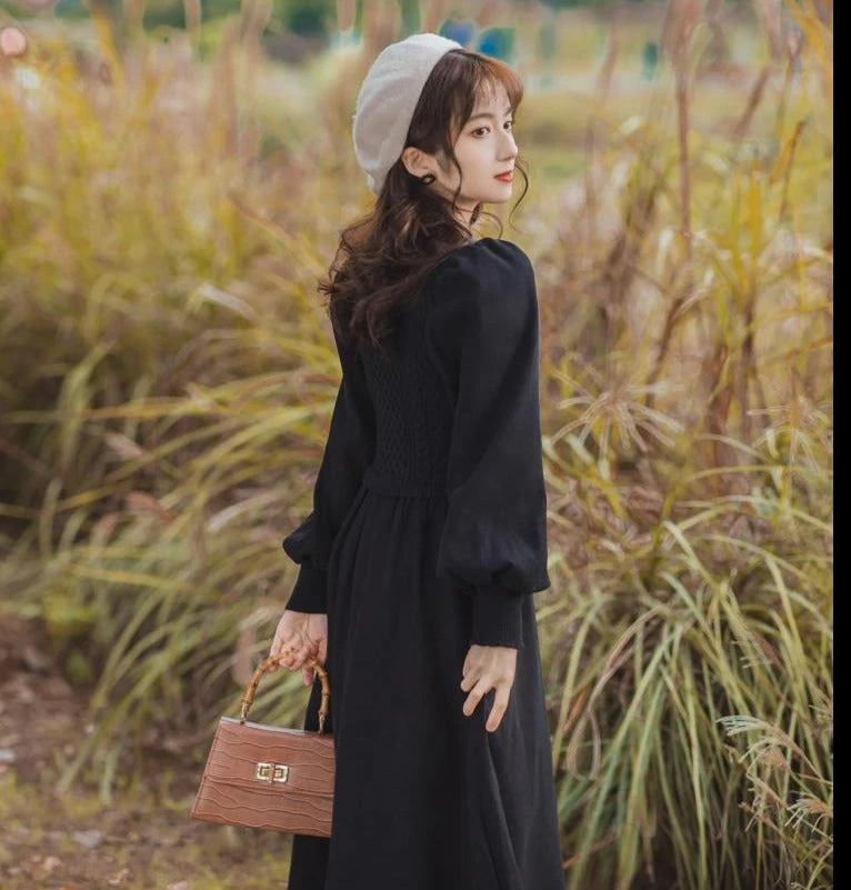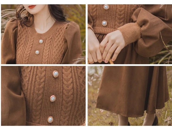 The soft silhouette of the sleeves and skirt gives it an elegant look with muted colors. The top part is made of knit fabric, and the gentle texture expresses warmth and femininity.