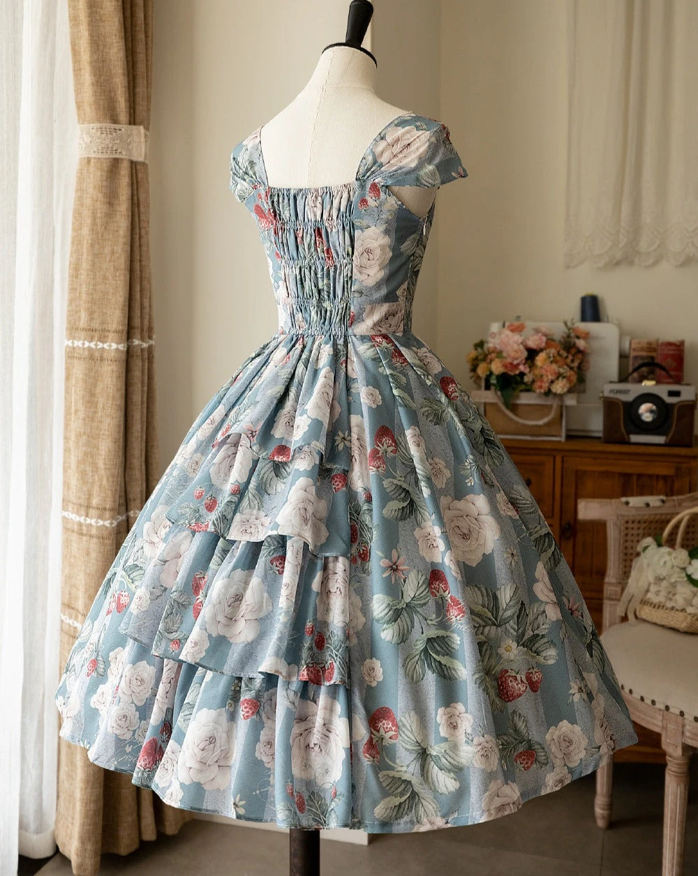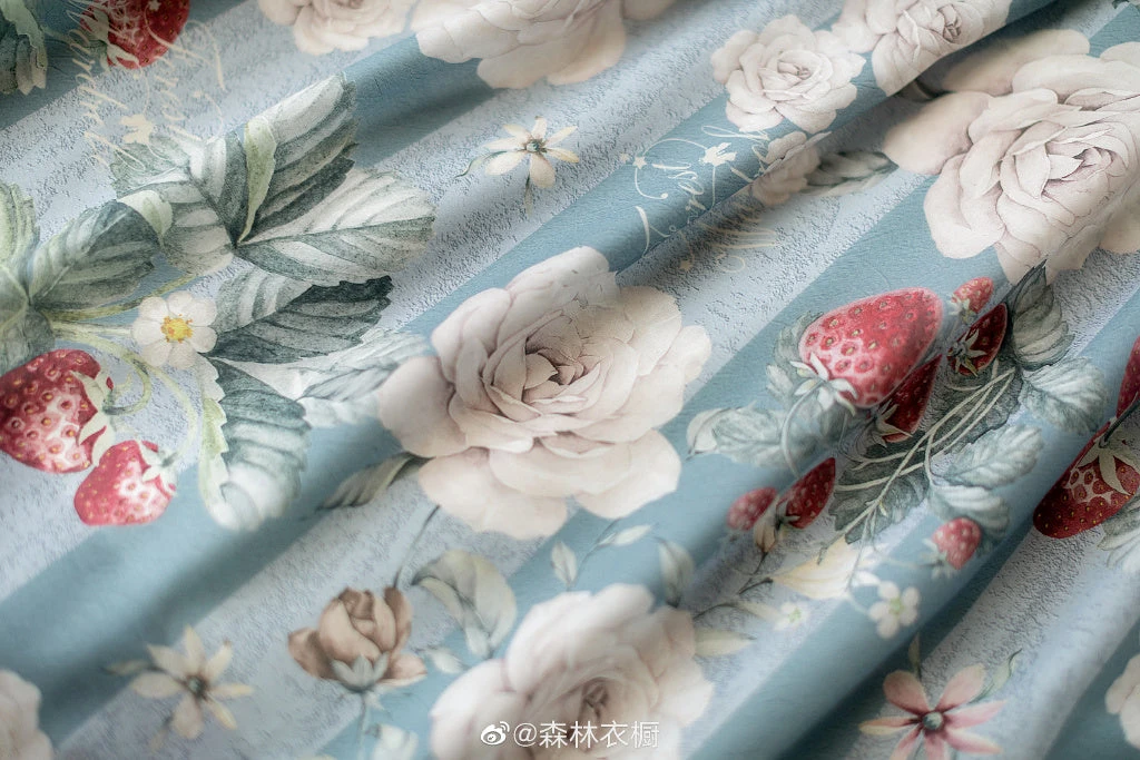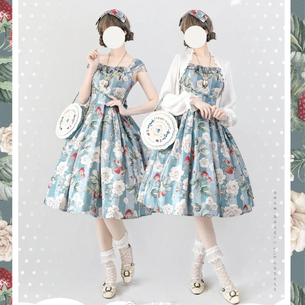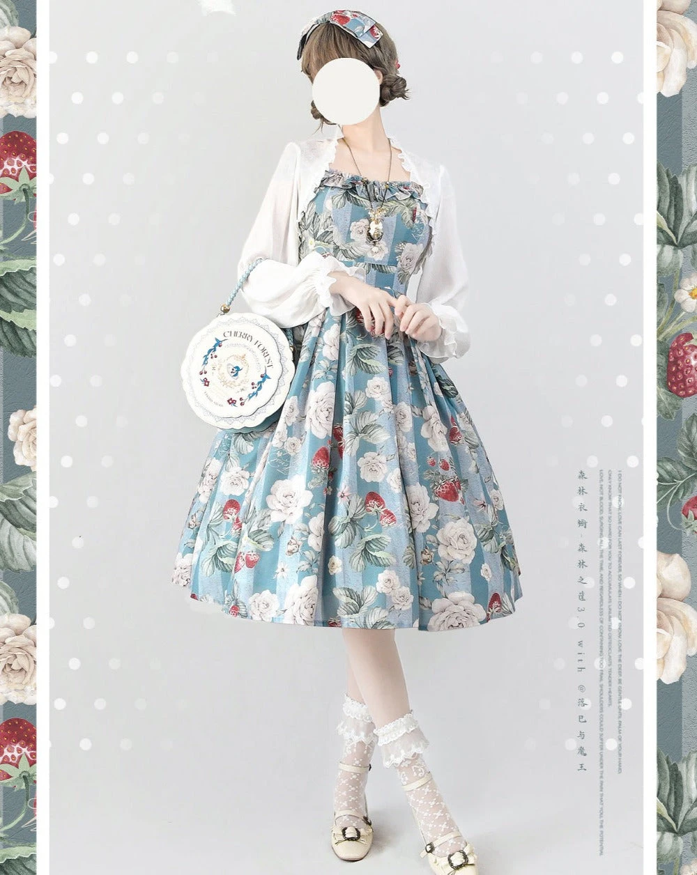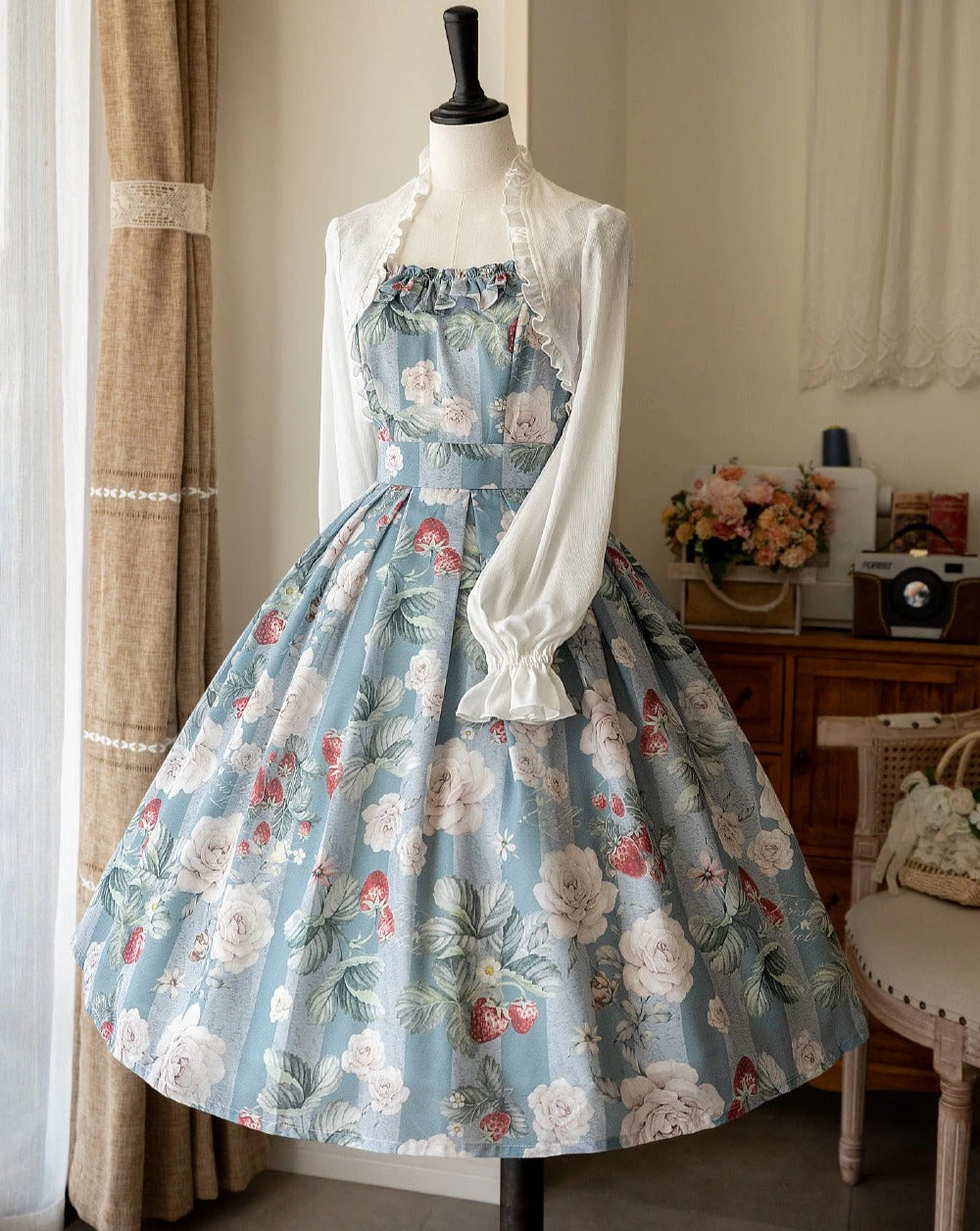 An elegant jumper skirt with roses and raspberries drawn on it. Comes with ribbon hair accessory of the same pattern.