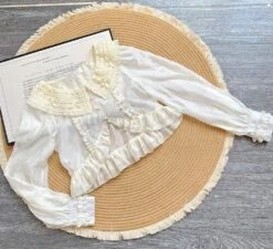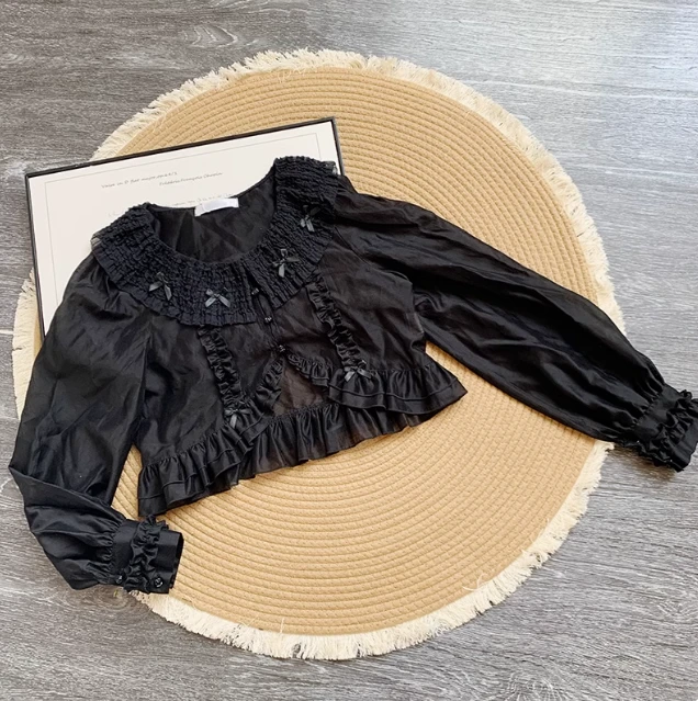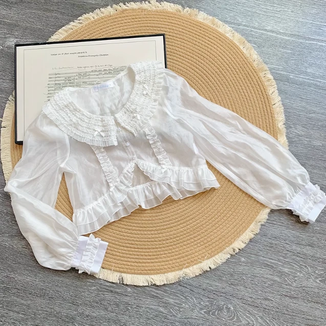 A cute long-sleeved cardigan with elegant ruffles and small ribbons.
