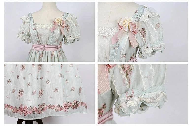 A cute short-sleeved dress with a rose bouquet and ribbon print.