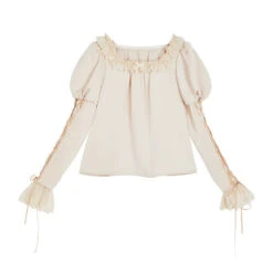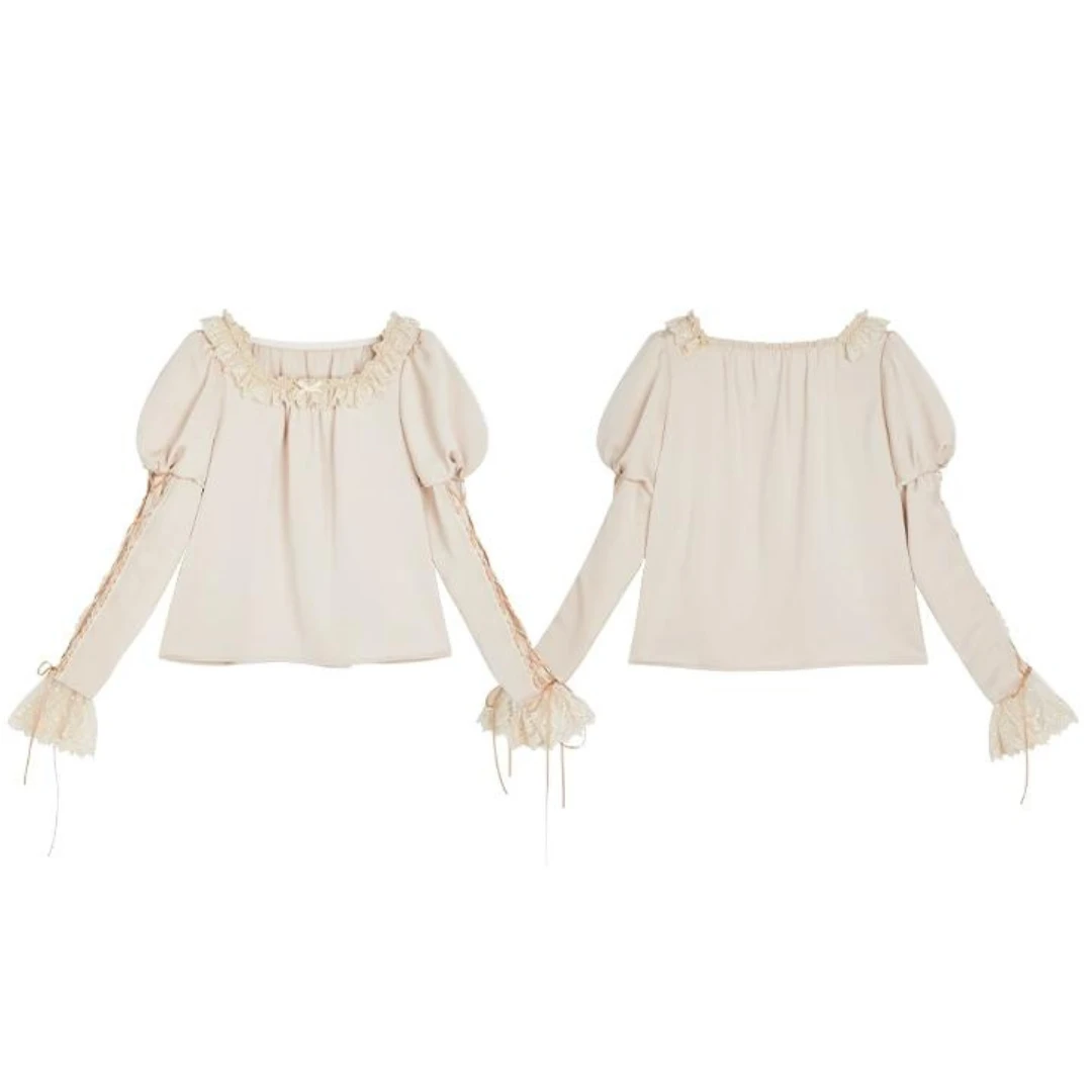 A cute long-sleeved blouse with a lace-up design and puff sleeves.