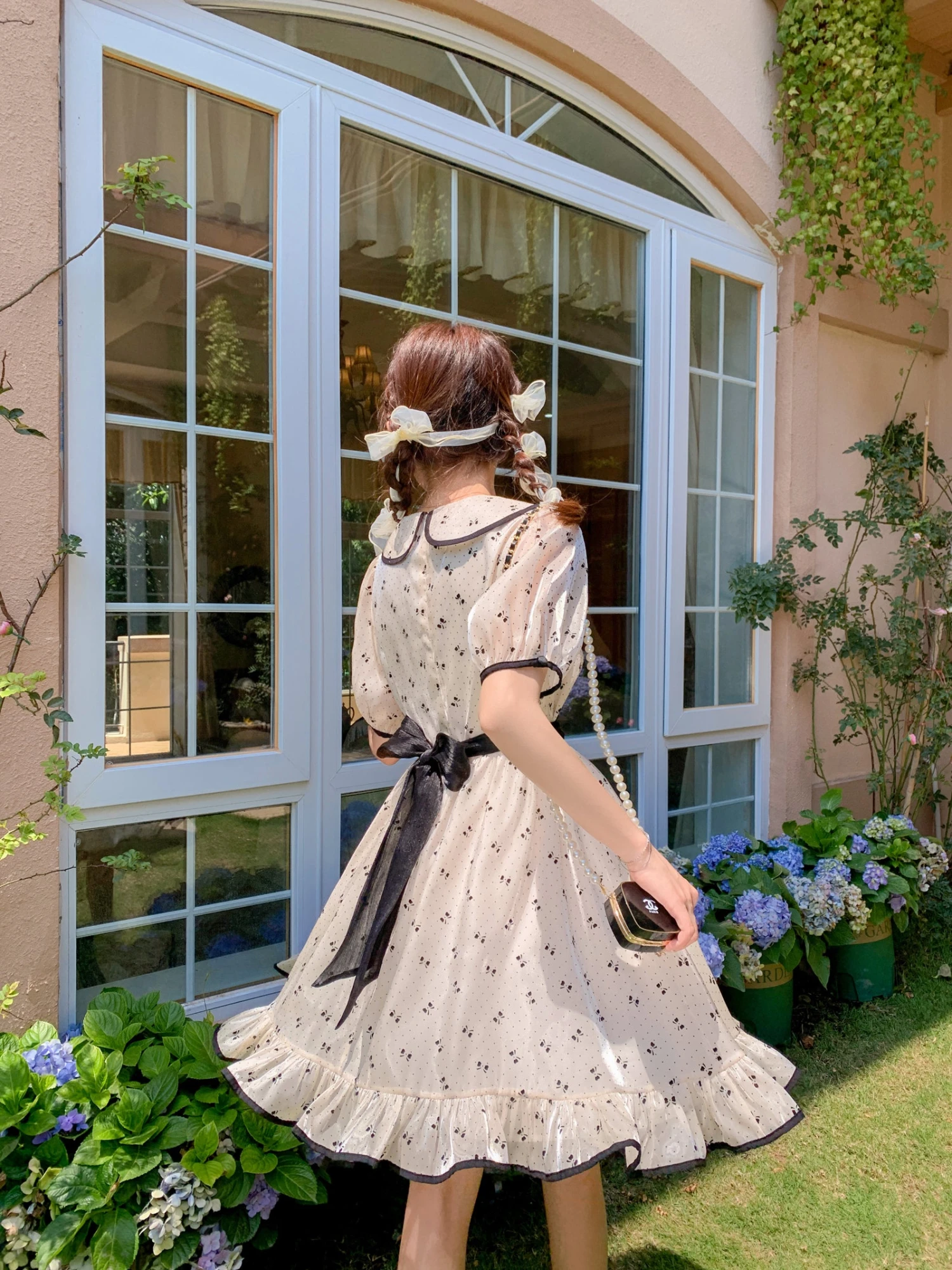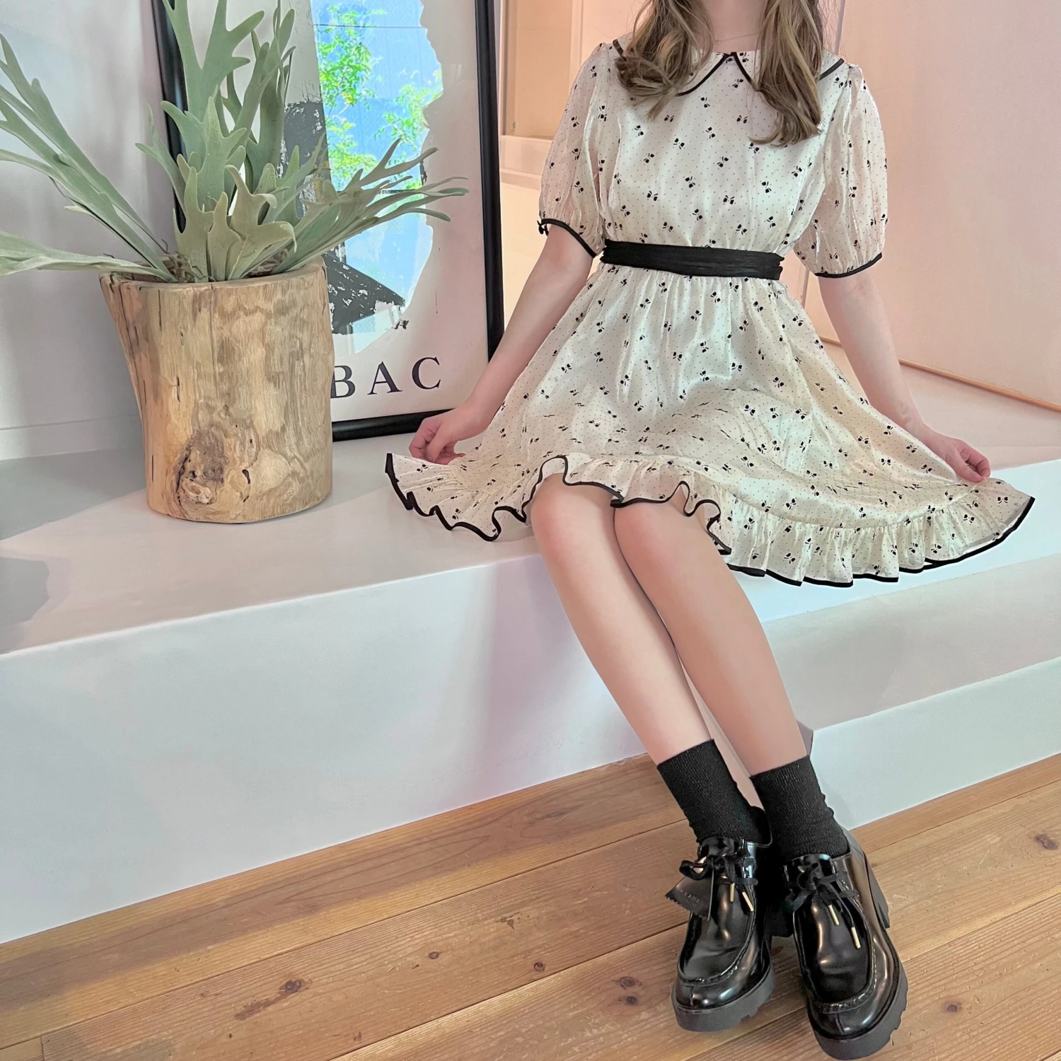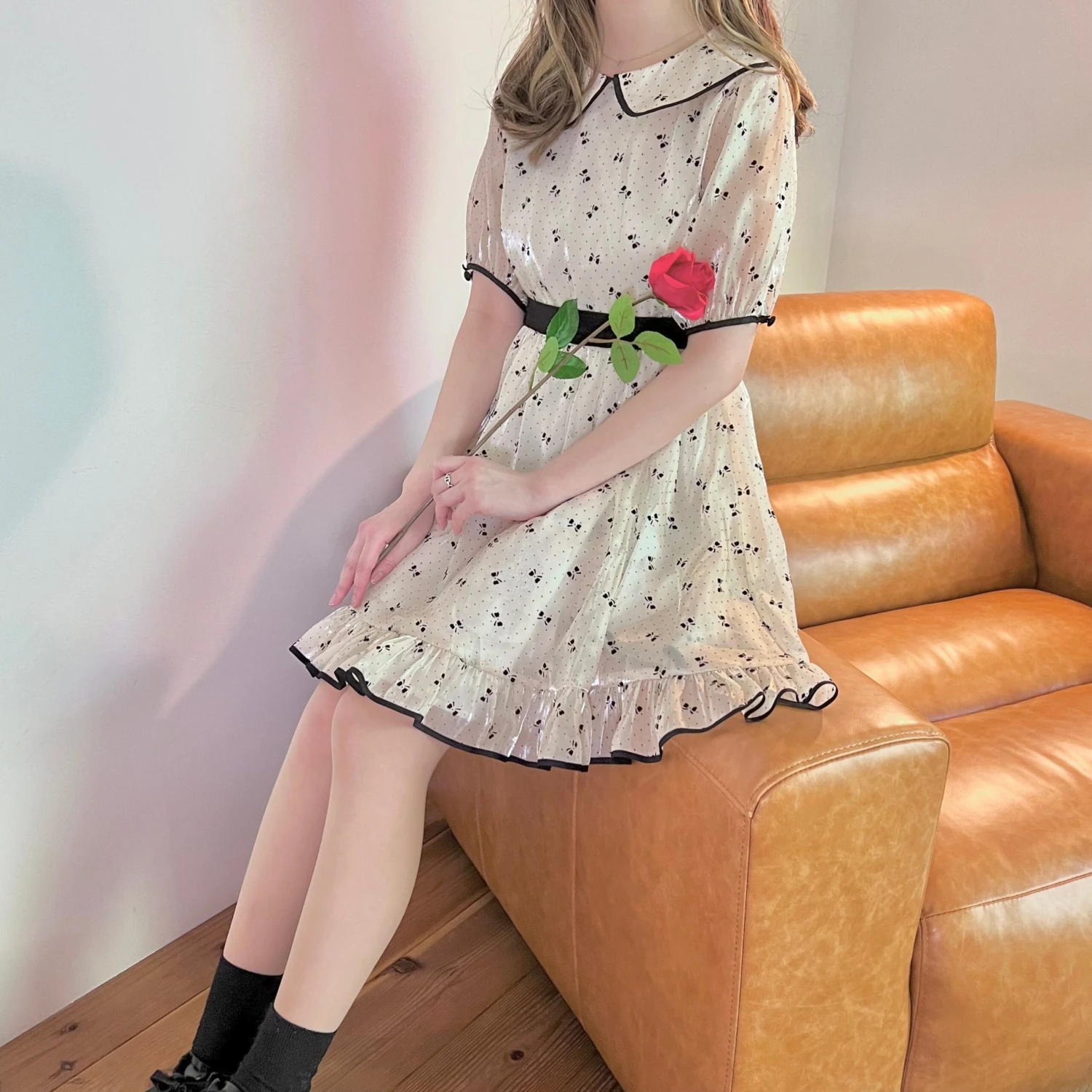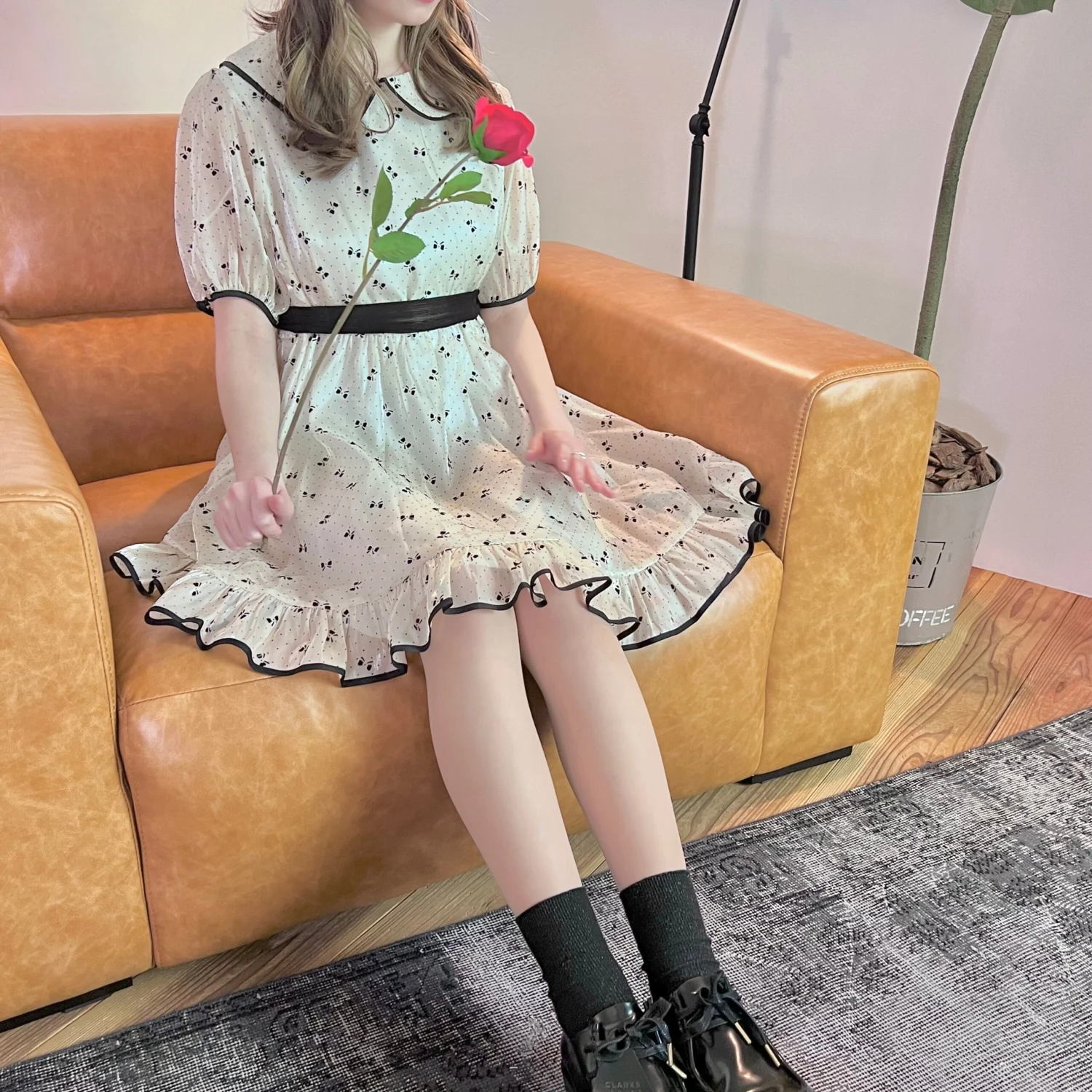 A cute off-white dress with a ribbon print.