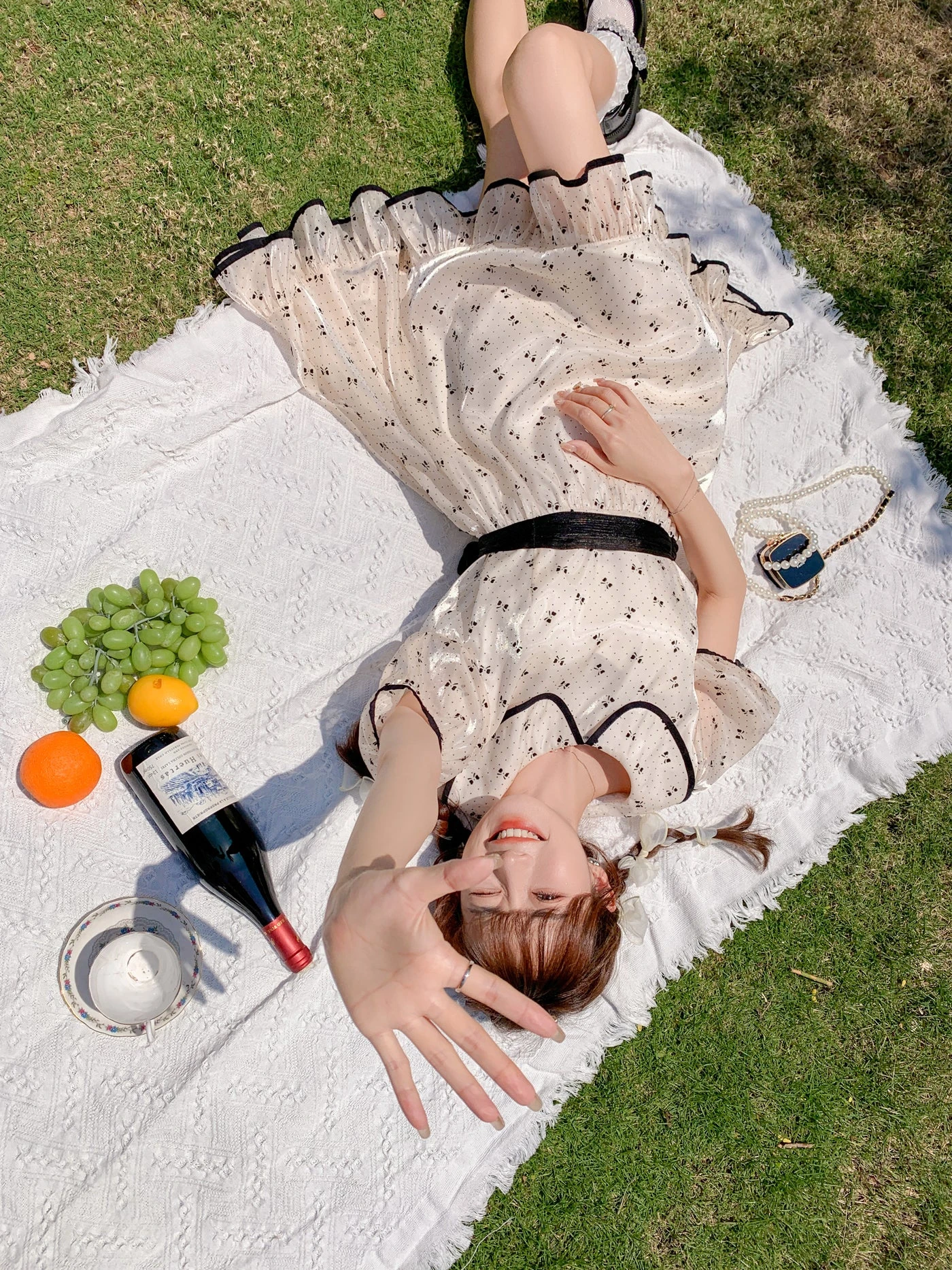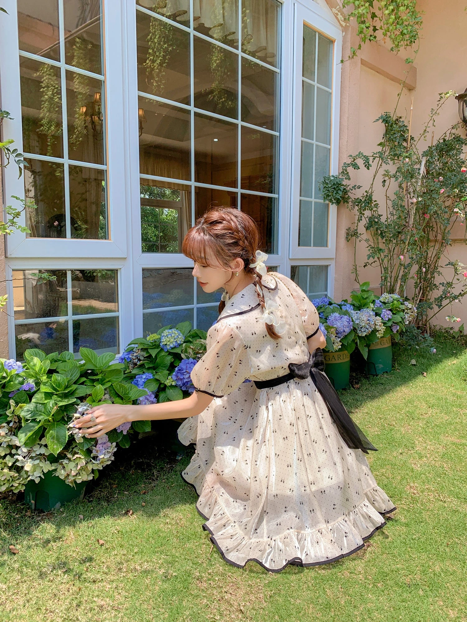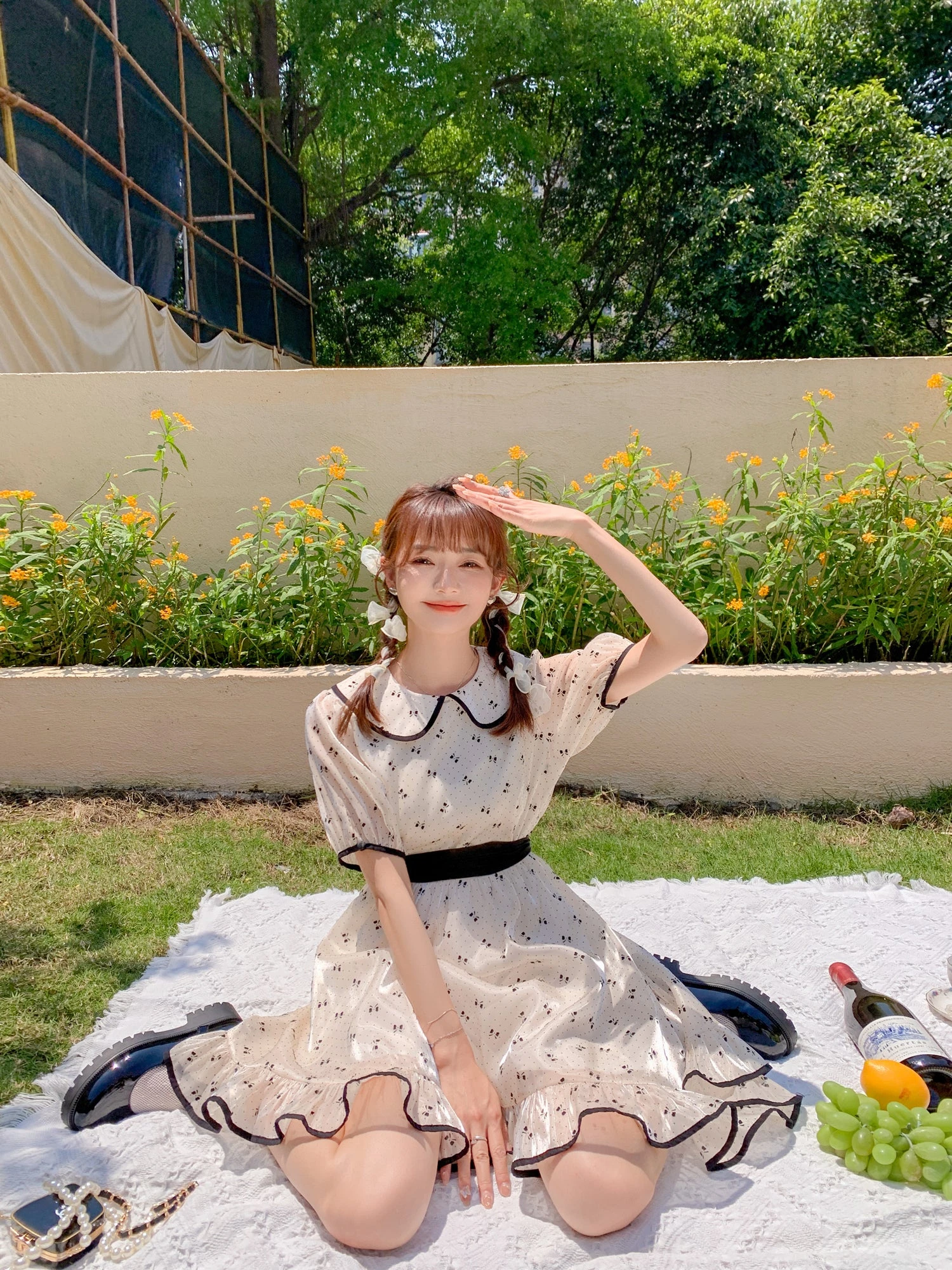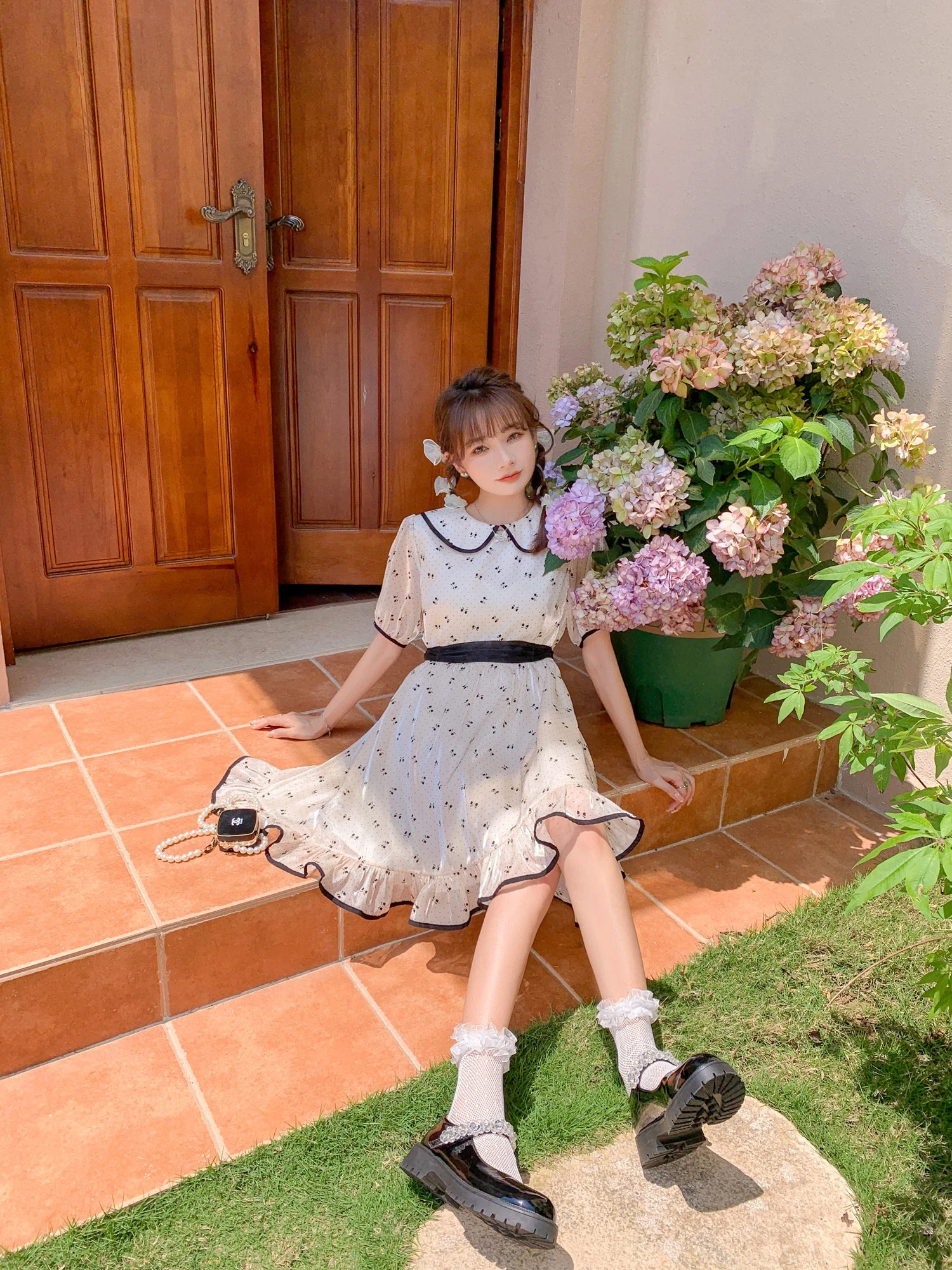 A cute off-white dress with a ribbon print.