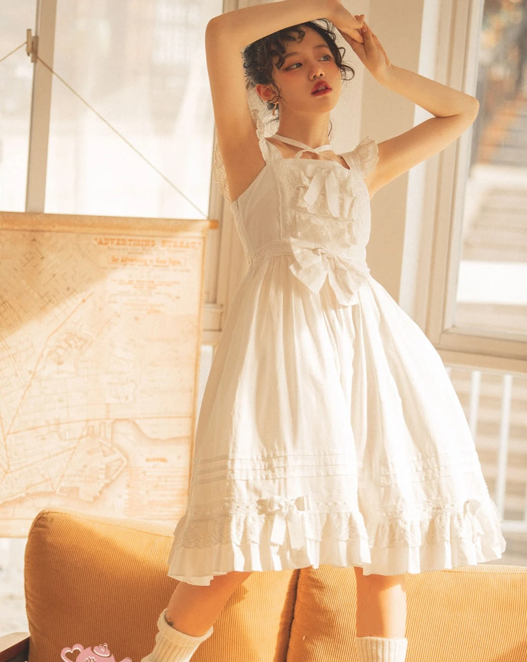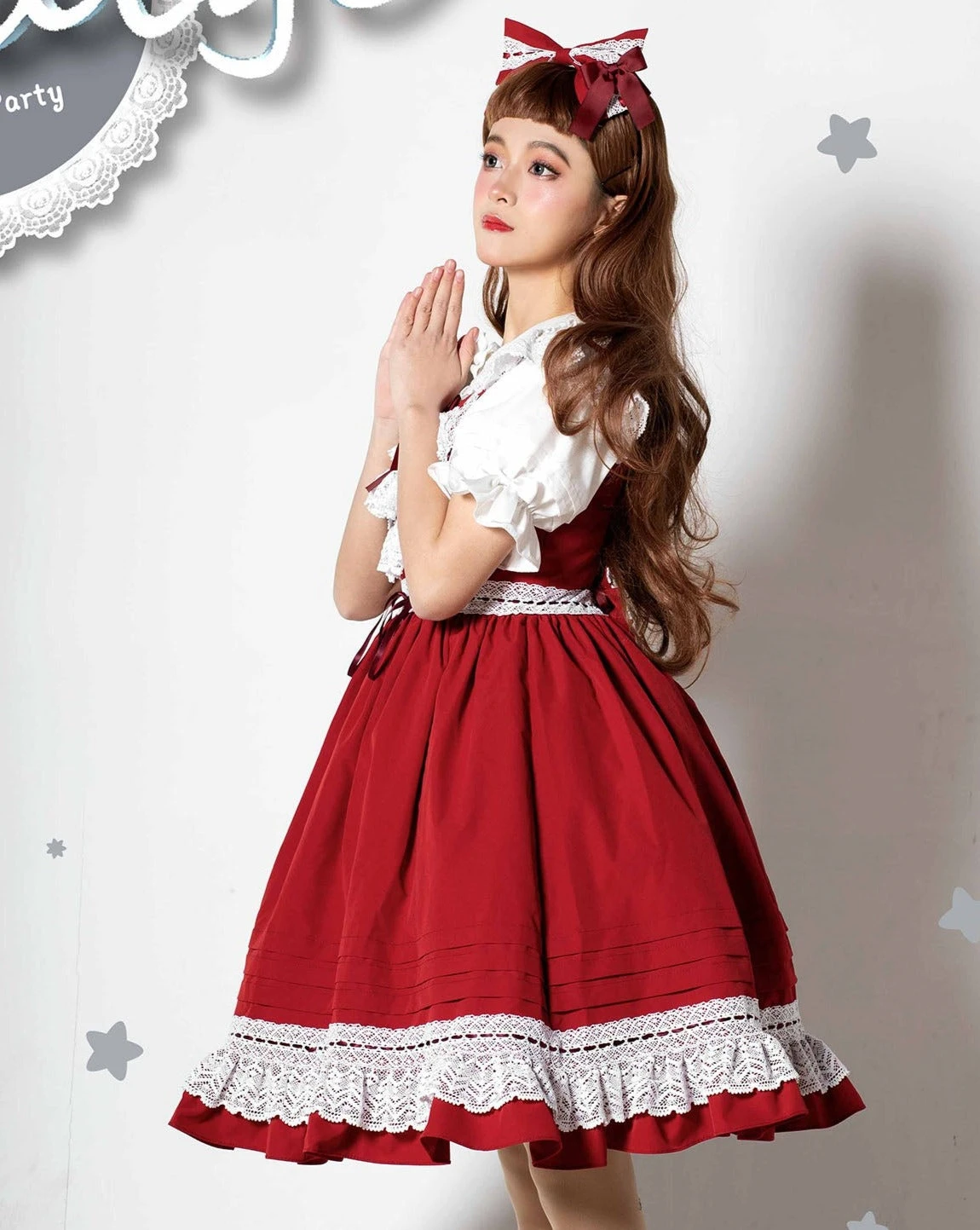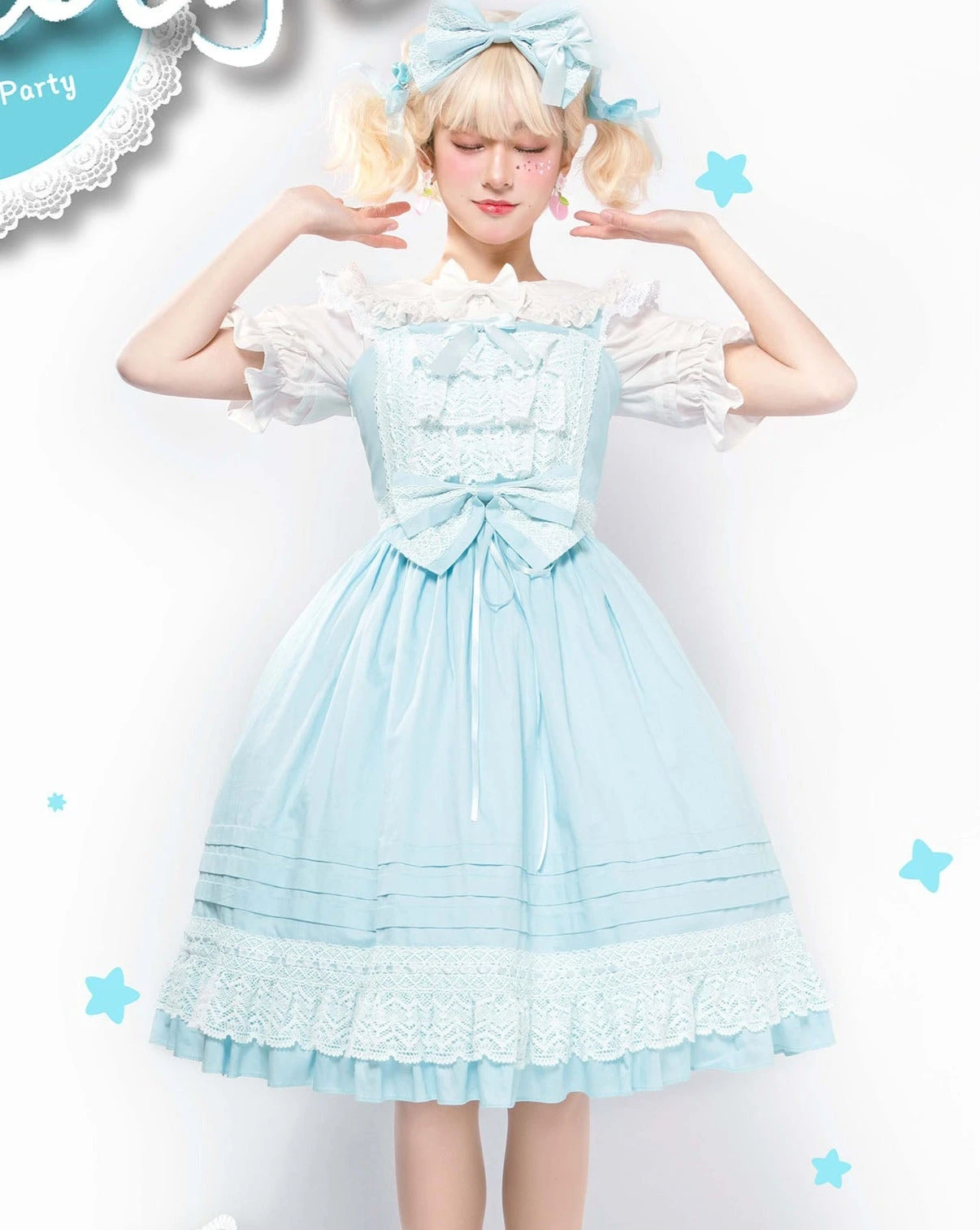 A jumper skirt with pure white lace and a ribbon that will give you a classic sweet loli outfit. Comes with a matching ribbon headband.
