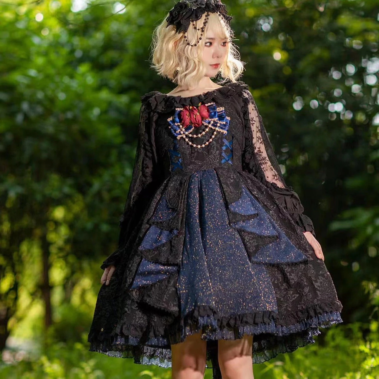 The delicate black lace and the sparkling deep blue are like a starry night. Add a rose corsage (sold separately) to create an even more mysterious atmosphere.