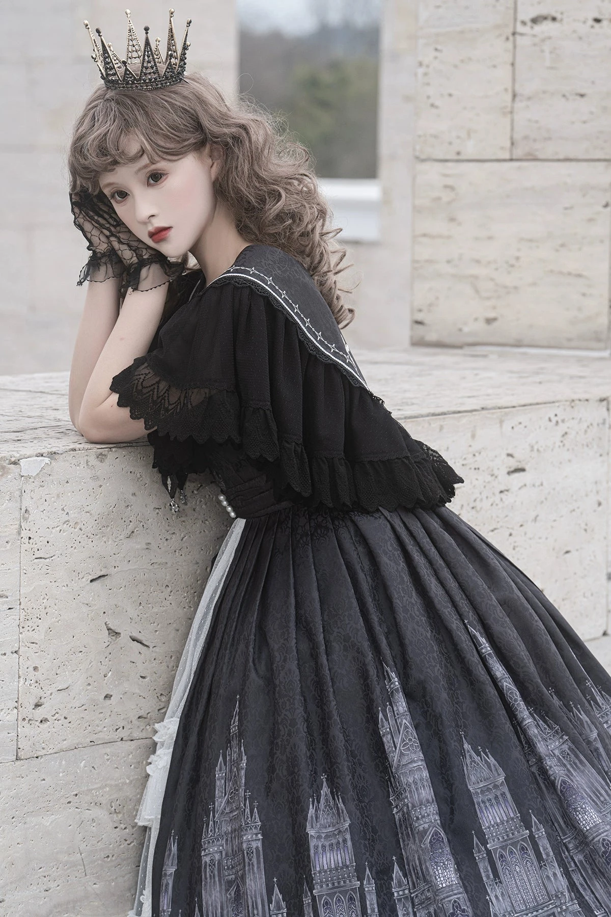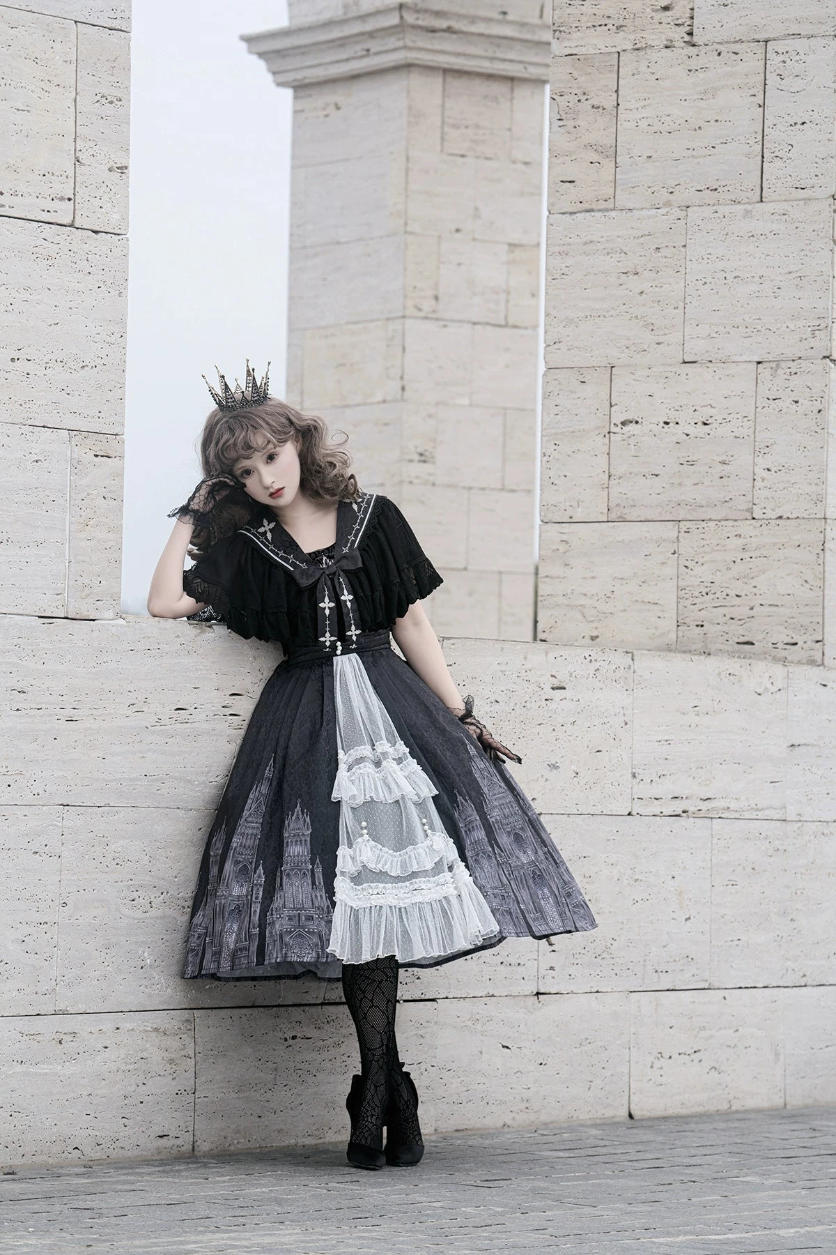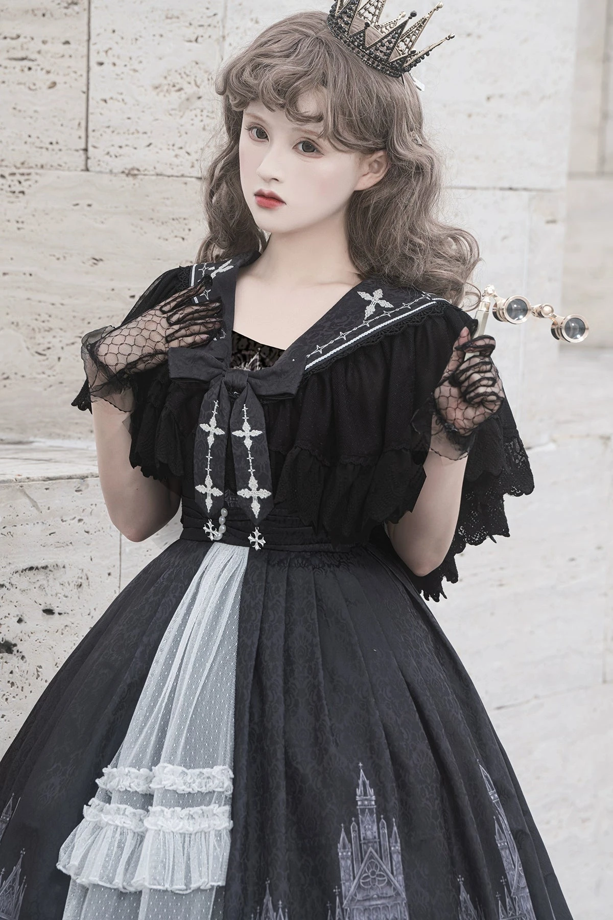 A jumper skirt and cape featuring a gothic cross motif.